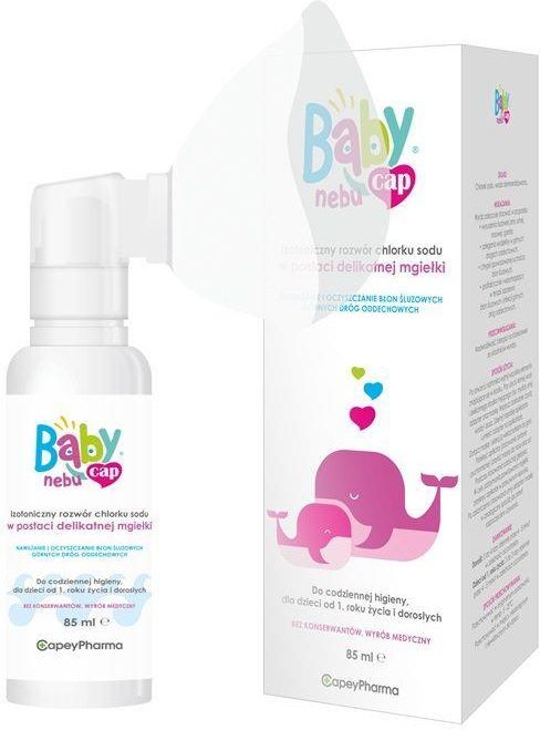 Babynebucap 85 ml to produkt zawierający izotoniczny roztwór chlorku sodu opracowany z myślą o delikatnym, a jednocześnie skutecznym nawilżaniu błon śluzowych nosa, jamy ustnej i gardła. Wyrób medyczny może być stosowany już od 1. roku życia. Mgiełka Babynebucap równomiernie dociera do górnych dróg oddechowych, co sprzyja ich prawidłowemu nawilżeniu i naturalnemu oczyszczaniu. Preparat może być pomocny w przypadku suchości śluzówek wynikającej ze złej jakości powietrza, klimatyzacji, infekcji czy alergii. Ułatwia usuwanie zalegającej wydzieliny w drogach oddechowych, zmniejszając ryzyko namnażania drobnoustrojów. Wyrób medyczny Babynebucap 85 ml nie zawiera konserwantów ani substancji leczniczych, dlatego może być używany profilaktycznie, tak często jak to potrzebne. Do opakowania dołączono maskę pozwalającą na wygodne i precyzyjne stosowanie produktu.