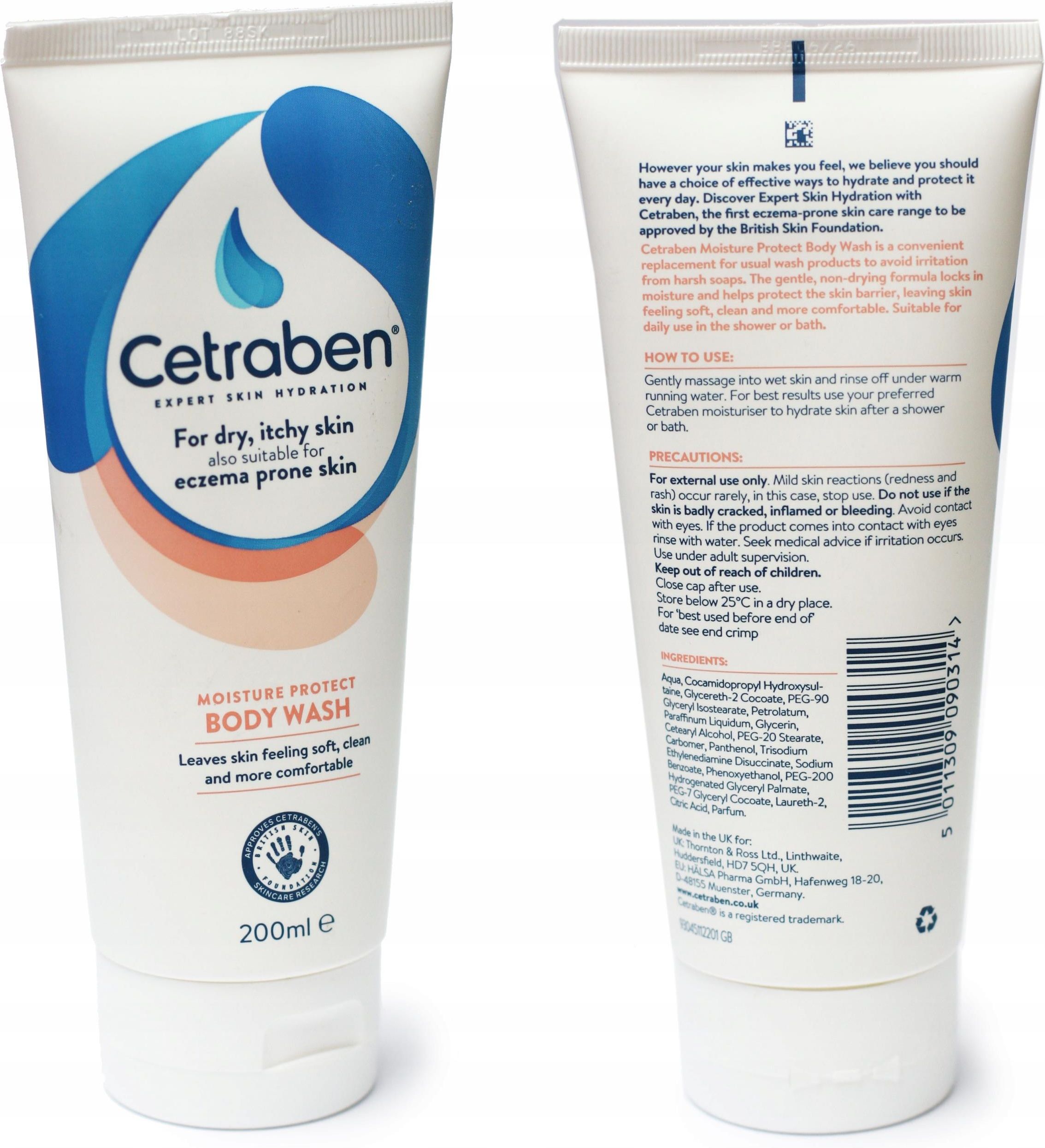 ✔️ dla dorosłych i dzieci Łagodna i Nie Wysuszająca Formuła | Zatrzymuje Nawilżenie | Pozostawia Skórę Miękką i KomfortowąCetraben Moisture Protect to delikatny żel do mycia ciała, który skutecznie oczyszcza skórę bez ryzyka podrażnień i przesuszenia. Jego unikalna formuła pomaga zatrzymać wilgoć w skórze i chronić jej naturalną barierę, dzięki czemu skóra pozostaje miękka, czysta i bardziej komfortowa.Główne zalety produktu:✅ŁAGODNA, NIE WYSUSZAJĄCA FORMUŁA – Pomaga zatrzymać wilgoć i chronić skórę, zapewniając jej miękkość i komfort.✅UNIKANIE PODRAŻNIEŃ – Stanowi doskonałą alternatywę dla tradycyjnych żeli myjących, eliminując ryzyko podrażnień wywołanych przez silne detergenty.✅ODPOWIEDNI DLA SKÓRY SUCHEJ I WRAŻLIWEJ – Idealny dla osób z suchą, wrażliwą i skłonną do egzemy skórą.✅ DO CODZIENNEGO STOSOWANIA – Można używać zarówno pod prysznicem, jak i w kąpieli.✅ZAUFANA MARKA – Produkt zatwierdzony przez Brytyjską Fundację Dermatologiczną. Cetraben to środek bezwonny▶️ bezbarwny▶️ nie zawierający żadnych dodatków chemicznych Jak stosować? Delikatnie wmasować w wilgotną skórę.2️⃣ Spłukać pod bieżącą, ciepłą wodą.3️⃣ Dla najlepszych efektów stosować razem z ulubionym nawilżającym balsamem Cetraben po kąpieli. Składniki Aqua, Cocamidopropyl Hydroxysultaine, Glycereth-2 Cocoate, PEG-90 Glyceryl Isostearate, Petrolatum, Paraffinum Liquidum, Glycerin, Cetearyl Alcohol, PEG-20 Stearate, Carbomer, Panthenol, Trisodium Ethylenediamine Disuccinate, Sodium Benzoate, Phenoxyethanol, PEG-200 Hydrogenated Glyceryl Palmate, PEG-7 Glyceryl Cocoate, Laureth-2, Citric Acid, Parfum. Ostrzeżenia Produkt przeznaczony wyłącznie do użytku zewnętrznego.