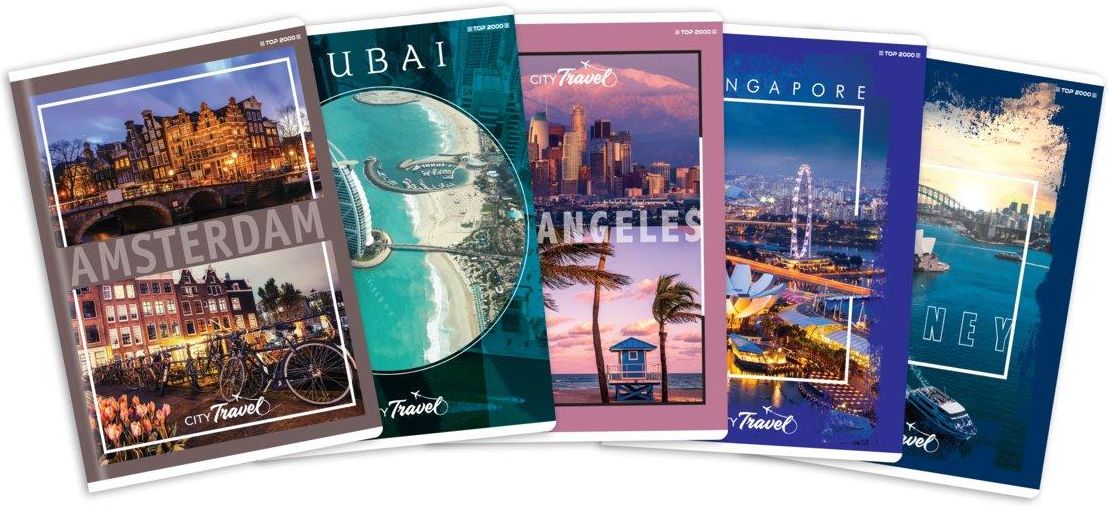 • Laminowane okładki z uszlachetnieniami • Grafiki z różnymi miastami świata • Okładki pokryte folią odporną na zadrapania • Dedykowana kolekcji adresówka i okładka wewnętrzna • Papier o gramaturze 70 g/m2