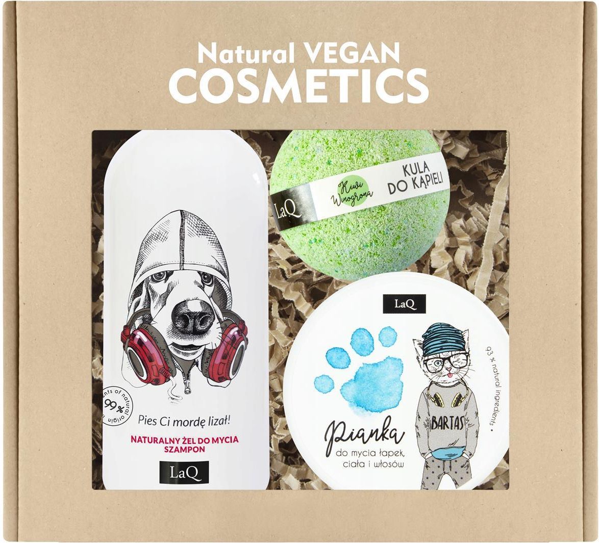 Zestaw kosmetyków dla dzieci żel PIES, pianka do łapek i kula musująca LaQ W skład zestawu wchodzi: Żel pod prysznic do mycia szampon 2 w 1 PIES: 300 ml Pianka do mycia łapek - NIEBIESKA: 50 ml Kula kąpielowa KIWI I WINOGRONA: 120 g Zestaw, który będzie umileniem kąpieli dla każdego malucha. Produkt, który z powodzeniem zabierzesz ze sobą na wakacje, sprawdzi się też idealnie w codziennej pielęgnacji. Żel do mycia ciała i włosów to nasza propozycja dla tych, którzy nie mają miejsca w łazience czy kosmetyczce lub po prostu nie lubią za dużo nosić. Do każdej butelki dodaliśmy kompleks postbiotyków, który nada skórze barierę ochronną, uniemożliwiając przesuszenie się skóry. Bogate składniki pochodzenia roślinnego nie tylko oczyszczą twoje ciało, ale dodatkowo ułatwią rozczesywanie włosów, bez ich dodatkowego obciążenia. Pachnąca pianka zamieni mycie rąk w świetną zabawę, a zapach gumy balonowej sprawi, że z przyjemnością sięgną po nią nawet dorośli, wracając wspomnieniem do dziecięcych lat! Pianka bazuje na łagodnych substancjach myjących pochodzenia roślinnego, została wzbogacona o nawilżający ekstrakt z mleka ryżowego, masło shea i olej ze słodkich migdałów. Dodatek kompleksu składników nawilżająco łagodzących m.in. alantoiny, pantenolu, balsamu Capaiba i oliwy z oliwek wzmacnia barierę ochronną skóry, pozostawiając ją doskonale nawilżoną i odżywioną. „Pianka do mycia powstała we współpracy z naszymi dziećmi: Natalką, Bartusiem i Agatką. To one wybrały kolory i niesamowity zapach gumy balonowej. Troskliwi rodzice, spójrzcie na nasz wegański, starannie dopracowany skład i zobaczcie że LaQ nie robi Was w balona! ” - Karolina Latanowicz Można jej używać zamiast mydła, żelu pod prysznic lub szamponu. Ręcznie wykonana, musująca kula do kąpieli. Wzbogacona masłem shea, olejem ze słodkich migdałów i witaminą E zapewnia skórze jedwabistą gładkość i doskonałe nawilżenie jak po użyciu balsamu. Może być stosowana także jako element domowej pielęgnacji stóp i dłoni. Środki ostrożności: Nie połykać. Unikać kontaktu z oczami. W przypadku dostania się do oczu natychmiast przemyć letnią wodą i skontaktować się z lekarzem. Nie stosować przy chorobowo zmienionej skórze lub w razie uczulenia na którykolwiek ze składników. W przypadku wystąpienia podrażnienia natychmiast przerwać stosowanie.