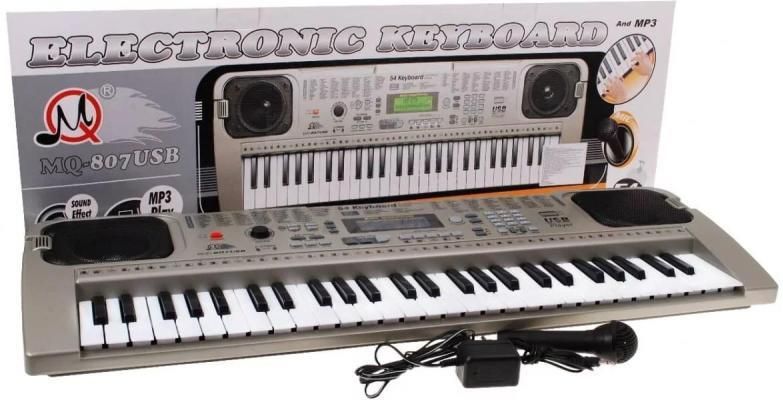 Keyboard jest wielofunkcyjną zabawką edukacyjną, która rozwija jednocześnie wyobraźnię, umiejętności muzyczne, poczucie rytmu, zmysł słuchu, a ponadto pozwala rozbudzać pasję muzyczną naszych małych wirtuozów. KEYBOARD POSIADA - klawiaturę muzyczną, 54 klawisze - przycisk zasilania on/off, - pokrętło regulacji głośności, - przycisk tonów - uruchamia 100 różnych tonów, - przycisk rytmów - uruchamia 100 różnych rytmów, - start/stop, - tempo, - akordy, - przycisk synchronizacji, - przycisk podtrzymywania, - przycisk wibracji, - przycisk echo, - grupa przycisków pod którymi kryją się różnego rodzaju bębny, - przycisk perkusja, - przycisk nagrywanie, - przycisk programowanie, - przycisk play, - przycisk lekcja, - przycisk piosenka, - przycisk demo A i demo B (kryją 10 różnych demo), - przyciski USB sto i USB play, - przyciski regulujące natężenie głośności materiału z USB, - cyfrowy wyświetlacz, - mikrofon, - zasilacz, - 2 głośniki. WYPOSAŻENIE ZESTAWU - keyboard, - zasilacz, - mikrofon, - kolorowe opakowanie idealnie nadające się na prezent. ZASILANIE INSTRUMENTU - przez sieć - zasilacz prądowy dołączony do keyboardu, WYMIARY - Keyboard ok. 70 x 23 x 6,5 cm.