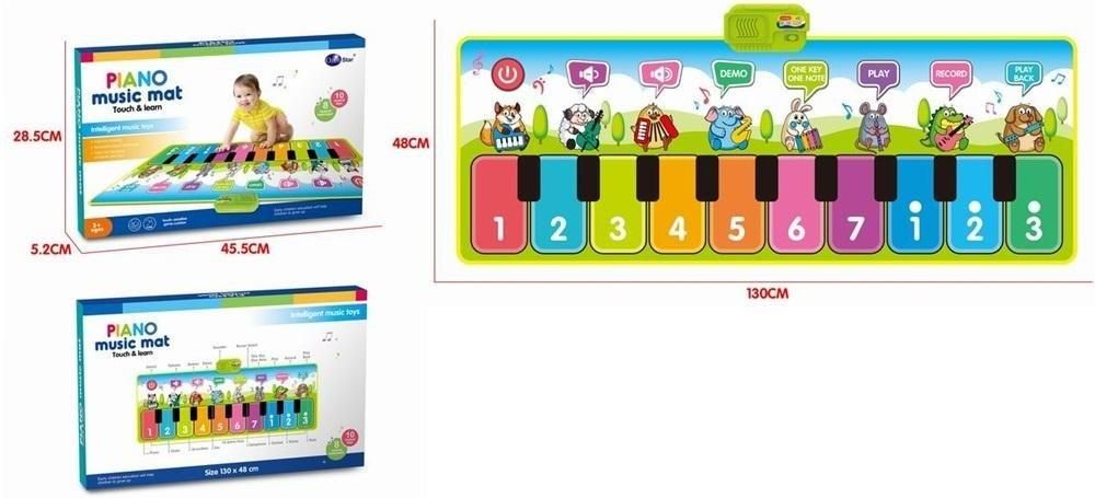 Muzyczna mata Mata muzyczna w formie pianinka to prawdziwe odkrycie dla najmłodszych muzyków i małych odkrywców. Zestawiając przyjemność zabawy z nauką i edukacją, ta fascynująca zabawka rozwija umiejętności muzyczne, kreatywność i koordynację ruchową dziecka w sposób niezwykle interaktywny i przyjemny. Mata posiada urocze motywy zwierzątek, które zachęcają dzieci do interakcji i eksploracji. Każdy klawisz reprezentuje inny instrument muzyczny, od gitary po żywiołowy akordeon czy klasyczne pianino. To zapewnia bogactwo dźwięków i rytmów, które dzieci mogą eksplorować i odkrywać. Rozwijają przy tym swoje zdolności słuchowe i rozbudzają wrażliwość na dźwięki. Mata muzyczna to doskonały sposób na wprowadzenie dziecka w świat muzyki. Dzięki prostocie obsługi, maluchy odkrywają radość z tworzenia własnych melodii i komponowania własnych utworów. Rozwijają wrażliwość na dźwięki, uczą się rozróżniać różne instrumenty i rytmiczne sekwencje, a wszystko to w zabawny i przystępny sposób. Mata nie tylko dostarcza rozrywki, ale także stanowi wartościowe narzędzie edukacyjne. Pomaga w rozwijaniu koordynacji wzrokowo-ruchowej, umiejętności rozpoznawania kształtów i kolorów oraz doskonali zdolności poznawcze dziecka. Jest to zatem zabawka, która łączy w sobie radość i edukację! Mata została wykonana z wytrzymałych i bezpiecznych materiałów, gwarantując trwałość i odporność na intensywną zabawę. Dzięki łatwemu w czyszczeniu materiałowi, rodzice mogą mieć pewność, że ich dziecko jest w bezpiecznym i higienicznym środowisku zabawy. Rozpocznij muzyczną przygodę i tańczącą zabawę z interaktywną matą muzyczną. To idealny produkt dla małych muzyków i tancerzy. Mata muzyczna to doskonały sposób na rozwijanie umiejętności muzycznych i kreatywności dziecka od najmłodszych lat. To nie tylko zabawka, to ekscytująca przygoda z muzyką, która inspiruje do eksperymentowania z dźwiękami i tworzenia własnych kompozycji. Otwórz drzwi do świata muzyki dla swojego dziecka z matą muzyczną! Wymiary opakowania: 51,5 x 34,5 x 5cm Wymiary maty: 60 x 148 cm