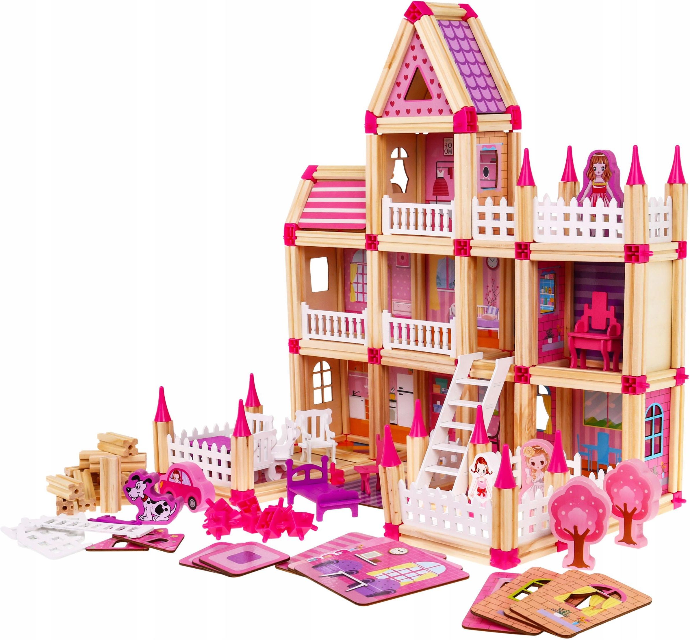Drewniany Domek 268el Różowy Zestaw drewnianych, kolorowych i bezpiecznych klocków dla dzieci od 3-go roku życia. Pakiet składa się z 298 elementów, które po ułożeniu tworzą drewniane domki dla księżniczek. Prócz elementów konstrukcyjnych w zestawie znaleźć możemy również klocki w kształcie drzewa, z postaciami księżniczek, czy autami, jest też obrazkowa instrukcja. Wymiary - drewniane elementy konstrukcyjne - mniejsze ok. 5 cm x 1,5 cm x 1,5 cm, większe ok. 9,5 cm x 1,5 cm x 1,5 cm, - klocki z kolorowymi rysunkami: * duże kwadraty ok. 9,8 cm x 9,8 cm, * małe kwadraty ok. 5,4 cm x 5,4 cm, * prostokąty 9,8 cm x 5,4 cm, * trójkąty duże ok. 8,2 cm x 9,4 cm, * trójkąty małe ok. 4,5 cm x 5 cm klocki w kształcie drzewa ok. 7 cm x 4,5 cm x 1 cm, klocki z postaciami księżniczek ok. 8,5 cm x 4,5 cm x 1 cm, klocki z autem ok. 6,5 cm x 4,2 cm x 1 cm, klocki w kształcie płotu - większe ok. 10 cm x 4 cm, mniejsze ok. 5,5 cm x 4,2 cm, łączniki ok. 3,2 cm x 2,2 cm, opakowanie ok. 38 cm x 28 cm x 10 cm. Zawartość zestawu drewniane elementy konstrukcyjne mniejsze i większe, klocki z kolorowymi rysunkami, kwadraty, prostokąty, trójkąty, klocki w kształcie drzewa, klocki z postaciami księżniczek, klocki z autkami, drewniane klocki z płotkiem, łączniki, obrazkowa instrukcja