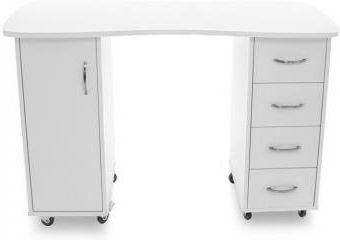 Funkcjonalne biurko kosmetyczne -idealne do gabinetów. Jest to mebel nie tylko funkcjonalny, ale jednocześnie niezwykle elegancki, idealnie komponujący się z wyposażeniem nowocześnie urządzonych pomieszczeń. Biurko kosmetyczne posiada szufladę, szafki o różnej wielkości. Mebel jest stabilny oraz łatwo go przestawiać w pomieszczeniach, nawet jeśli jest obciążony. Dane techniczne: wys biurka: 80cm, dł blatu 121cm szer blatu 46cm odległość blatu od szafki 7,5cm wymiary szafki: wys: 77cm dł: 34cm szer:30cm 4 szuflady: dł 27cm szer: 21cm, wys: 15cm 1 szafka z półką: dł 31cm szer: 27cm wys: 68cm wymiary: 1. 76*45*86 2. 130*12*55
