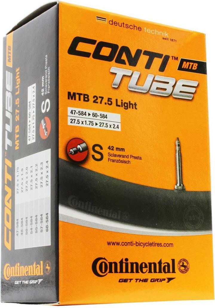 Dętka Continental MTB 27,5" x 1,75" - 2,5" LIGHT wentyl presta 42 mm 148 g CO0182341 Rozmiar: Dętka pasuje do kół z oponami o rozmiarze w zakresie 27,5" x 1,75" - 2,4" (47/60-584). W powyższym zakresie podana jest średnica kół do jakich dętka pasuje, to jest 27,5" (ETRTO 584) oraz szerokość opon z jakimi jest kompatybilna: od 1,75" do 2,4" (ETRTO 47-60). Przykłady rozmiarów opon do których może zostać użyta: 27,5" x 1,75" (47-584) 27,5" x 1,9" (48-584) 27,5" x 2,0" (50-584) 27,5" x 2,1" (54-584) 27,5" x 2,2" (55-584) 27,5" x 2,3" (57-584) 27,5" x 2,4" (60-584) Wentyl: presta o długości 42 mm. Wentyle stosowane przez Continental posiadają specjalnie profilowaną nakrętkę stabilizującą wentyl w obręczy. Profilowanie nakrętki umożliwia również montaż wentyla w obręczach posiadających otwór o średnicy 8 mm (dedykowany dla wentyli samochodowych i dunlop). Wentyle presta pompujemy przy użyciu dokładnie takich samych pompek co wentyle dunlop (rowerowe). Średnia waga produktu: 148 g Conti-Tube Nowa oferta dętek Continental ułatwia znalezienie tej jednej, właściwej dla Ciebie. Przyjazna dla użytkownika oferta odpowiada wielorakim rozmiarom, typom zaworów, ich długościom i konstrukcjom, jak również różnym rodzajom opon i stylom jazdy. Różnorodność dętek pozwala na właściwy wybór: dętka standardowa jest dostępna we wszystkich rozmiarach, oferuje najlepszy kompromis pomiędzy codzienną jazdą, a wagą, podczas gdy w wersjach Light i Supersonic największe znaczenie ma waga i opór toczenia. Dętka z serii LIGHT o cieńszych ściankach niż standardowe dętki. Dzięki temu uzyskano bardzo niską wagę produktu. O systemie Unitube w dętkach Continental: Dętki wielorozmiarowe pasują do większej ilości rozmiarów opon niż tradycyjne dętki rowerowe. Wszystkie dętki są bezszwowe i wulkanizowane celem zapewnienia jednakowej okrągłości i zwiększonej niezawodności trzonu wentyla. Każdy egzemplarz przechodzi bardzo rygorystyczną kontrolę jakości