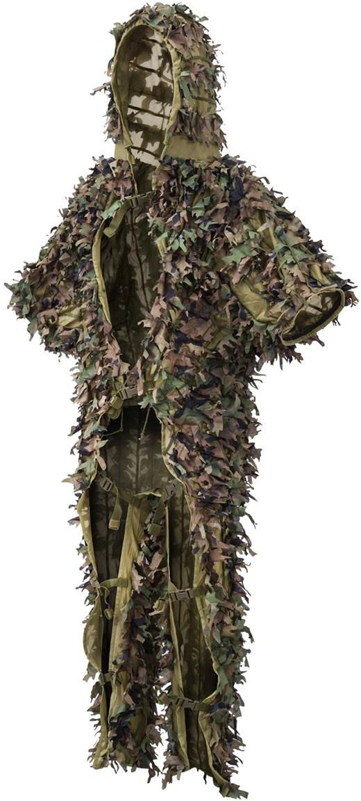 Dwuczęściowy strój maskujący Leaf Ghilie w kamuflażu US Woodland używany głównie przez strzelców wyborowych oraz zwiadowców. Wykonany został z wytrzymałego i odpornego na działanie wilgoci poliestru. Luźny krój pozwala zakładać go na każdy typ odzieży i nakrycie głowy. Leaf Ghilie czyni osobę w niego ubraną całkowicie niewidoczną. Dwustronnie drukowane sztuczne liście w kamuflażu zwiększają możliwość wtopienia się w otoczenie. Rzędy linek paracordowych na wierzchniej stronie pozwalają na doczepienie dodatkowego kamuflażu pochodzącego z otoczenia (trawy, paprocie etc.). Klamry Woojin z możliwością regulacji ułatwiają dopasowanie stroju do użytkownika. Strój charakteryzuje się wysoką oddychalnością, co znacznie zwiększa komfort użytkowania w trudnych warunkach. Górną i dolną część stroju można nosić oddzielnie. Złożony zajmuje niewiele miejsca i z łatwością może być przenoszony w plecaku lub torbie. Kompresyjny pokrowiec ułatwia przechowywanie i transportowanie. Dane techniczne: Materiał: poliester Kamuflaż: US Woodland Waga: 800 g Producent: Helikon, Polska