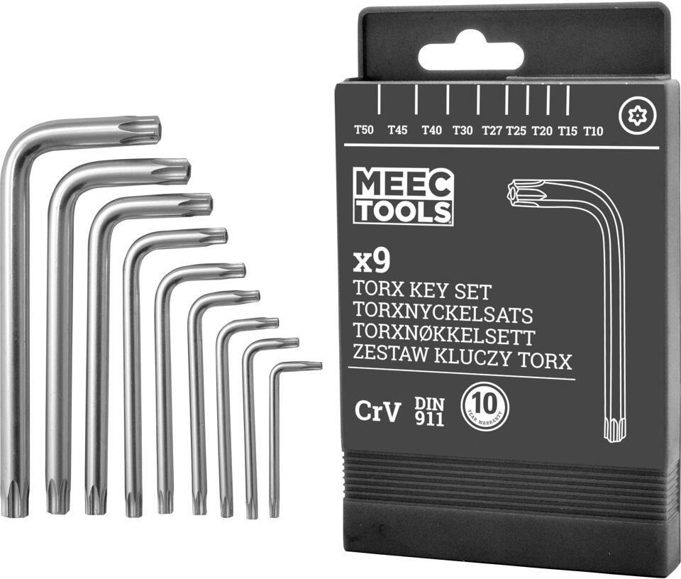Zestaw kluczy Torx 9el. Meec tools Klucze Torx ze stali chromowo-wanadowej. Komplet kluczy marki Meec Tools zawiera 9 kluczy Torx ze stali chromowo-wanadowej. 9 różnych rozmiarów Klucze Torx w rozmiarach T10/15/20/25/27/30/40/45/50. Etui z tworzywa w zestawie. Specyfikacja techniczna Gwarancja (w miesiącach): 120 m.