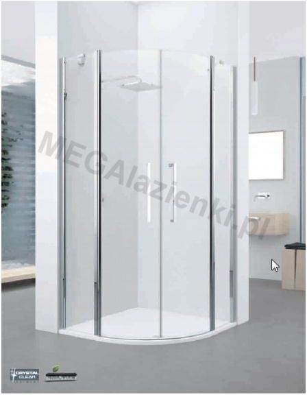 Kabina półokrągłą dwu skrzydłowa Wysokość kabiny 200 cm Zawiasy podnoszą się drzwi podczas otwierania szkło przeźroczyste z powłoką ułatwiająca czyszczenie Możliwość zamówienia zamówienia innego wypełnienia szkła do kompletowania z brodzikiem Rodzaje szkieł