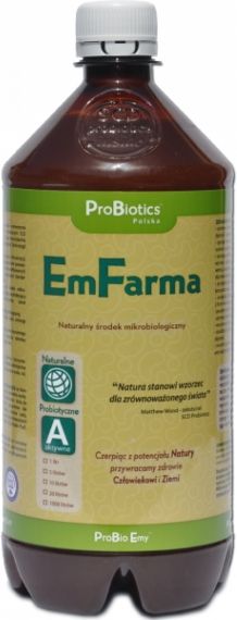 Certyfikat:PZH/HT 2508/2011Właściwości:EmFarma to kompozycja pożytecznych naturalnych mikroorganizmów zawierająca kilkadziesiąt szczepów pożytecznych mikroorganizmów - bakterii kwasu mlekowego, drożdży, bakterii fotosyntetyzujących, promieniowców i grzybów fermentujących. Kompozycja ta wzbogacona o szeroką gamę mikroelementów niezbędnych dla optymalnego rozwoju pożytecznych mikroorganizmów jest wyjątkową w działaniu. Pełni funkcje prewencyjne przeciwko chorobom na skutek wypierania ich i tworzenia warunków uniemożliwiających, bądź przynajmniej utrudniających ich rozwój. Z kolei bogactwo mikroelementów i bakterii fotosyntetyzujących stanowi doskonałe źródło pożywienia dla rośliny w formule naturalnego biostymulatora wzrostu. Szerokie spektrum działania preparatu pozwala na zastosowanie go w rolnictwie i rewitalizacji środowiska.-Wykazuje działanie antyseptyczne i antyutleniające.-Preparat ten jest powszechnie używany do higienizacji budynków hodowlanych, zaprawiania nasion, ograniczania bądź eliminacji chorób pleśniowych i mączniaków.-Poprawia aktywność biologiczną gleby i jej strukturę.-Stymuluje wzrost i rozwój roślin.-Zwiększa przyswajalność składników pokarmowych.Zastosowanie:Poprawa jakości gleby, neutralizacja odorów, higienizacja pomieszczeń.EmFarma jest preparatem gotowym do użycia po rozcieńczeniu zdrową wodą.Opakowanie: 5 litrów