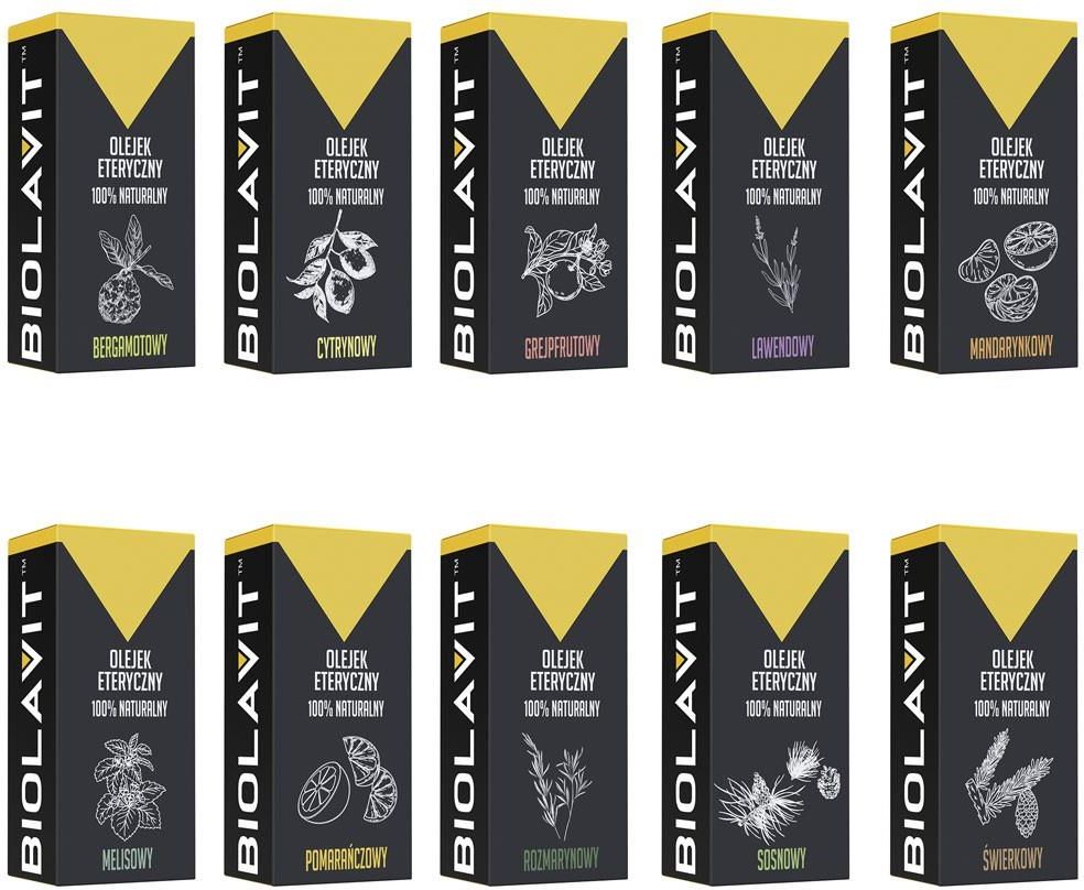Bilovit Zestaw olejków eterycznych 10 sztuk - 10 ml Zestaw 10 olejków eterycznych marki Bilovit. W zestawie znajdują się olejki - bergamotowy, cytrynowy, grejpfrutowy, lawendowy, mandarynkowy, melisowy, pomarańczowy, rozmarynowy, świerkowy oraz sosnowy. Zestaw zawiera 1x Bilovit Olejek eteryczny grejpfrutowy - 10 ml 1x Bilovit Olejek eteryczny cytrynowy - 10 ml 1x Bilovit Olejek eteryczny bergamotowy - 10 ml 1x Bilovit Olejek eteryczny świerkowy - 10 ml 1x Bilovit Olejek eteryczny sosnowy - 10 ml 1x Bilovit Olejek eteryczny rozmarynowy - 10 ml 1x Bilovit Olejek eteryczny melisowy - 10 ml 1x Bilovit Olejek eteryczny lawendowy - 10 ml 1x Bilovit Olejek eteryczny mandarynkowy - 10 ml 1x Bilovit Olejek eteryczny pomarańczowy - 10 ml Olejek eteryczny grejpfrutowy Olejek grejpfrutowy to produkt pozyskiwany z owoców drzewa grejpfrutowego. Wykazuje właściwości antytoksyczne, tonizujące, pobudzające i antydepresyjne. Olejek eteryczny cytrynowy Olejek cytrynowy to produkt pozyskiwany z owoców drzewa cytrusowego. Ma on właściwości pobudzające, antydepresyjne, antyreumatyczne, ściągające, tonizujące, przeciwbólowe i antytoksyczne. Olejek eteryczny bergamotowy Olejek bergamotowy to produkt otrzymywany z owoców drzewa bergamotowego. Jego zapach odświeża i rozjaśnia umysł, a także pobudza do pracy. Olejek jest doskonałym antyseptykiem. Działa tonizująco i dezodoryzująco. Olejek eteryczny świerkowy Olejek świerkowy to produkt naturalny pozyskiwany z młodych pędów świerku pospolitego. Wykazuje właściwości antyseptyczne, przeciwzapalne i przeciwzakaźne. Olejek eteryczny sosnowy Olejek sosnowy to produkt pozyskiwany z igieł sosny zwyczajnej. Ma właściwości antyseptyczne, przeciwzakaźne, dezodoryzujące, bakteriobójcze, tonizujące, przeciwbólowe i rozgrzewające. Olejek eteryczny rozmarynowy Olejek rozmarynowy to produkt pozyskiwany z krzewu rozmarynu. Wykazuje właściwości antyseptyczne, tonizujące, bakteriobójcze, antyreumatyczne, antydepresyjne i rozgrzewające. Olejek eteryczny melisowy Olejek melisowy to produkt otrzymywany z ziela melisy lekarskiej. Wykazuje właściwości uspokajające, przeciwbólowe i antydepresyjne. Olejek eteryczny lawendowy Olejek lawendowy to produkt otrzymywany ze świeżych kwiatów lawendy wąskolistnej. Ma właściwości antyseptyczne, dezynfekujące, przeciwzapalne, uspokajające i wyciszające. Polecana jest jako środek przyspieszający proces gojenia się ran, ukąszeń owadów i oparzeń. Olejek eteryczny mandarynkowy Olejek mandarynkowy to produkt pozyskiwany z owoców drzewa mandarynkowego. Wykazuje właściwości antyseptyczne, tonizujące i uspokajające. Wpływa kojąco na układ nerwowy i działa antydepresyjnie. Olejek eteryczny pomarańczowy Olejek pomarańczowy to produkt otrzymywany z owoców drzewa pomarańczowego. Wykazuje właściwości antyseptyczne, przeciwskurczowe, tonizujące, antydepresyjne i uspokajające. Kod produktu: BIOL7
