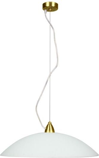 biały klosz ze szkła giętego, idealnie gładki, bez wzoru, matowy po stronie zewnętrznej, złożony proces produkcji: piaskowanie, polerowanie i malowanie, eleganckie zawiesie na stalowej lince z transparentnym przewodem i dekoracyjną metalową nadkloszówką w wykończeniu mosiężnym