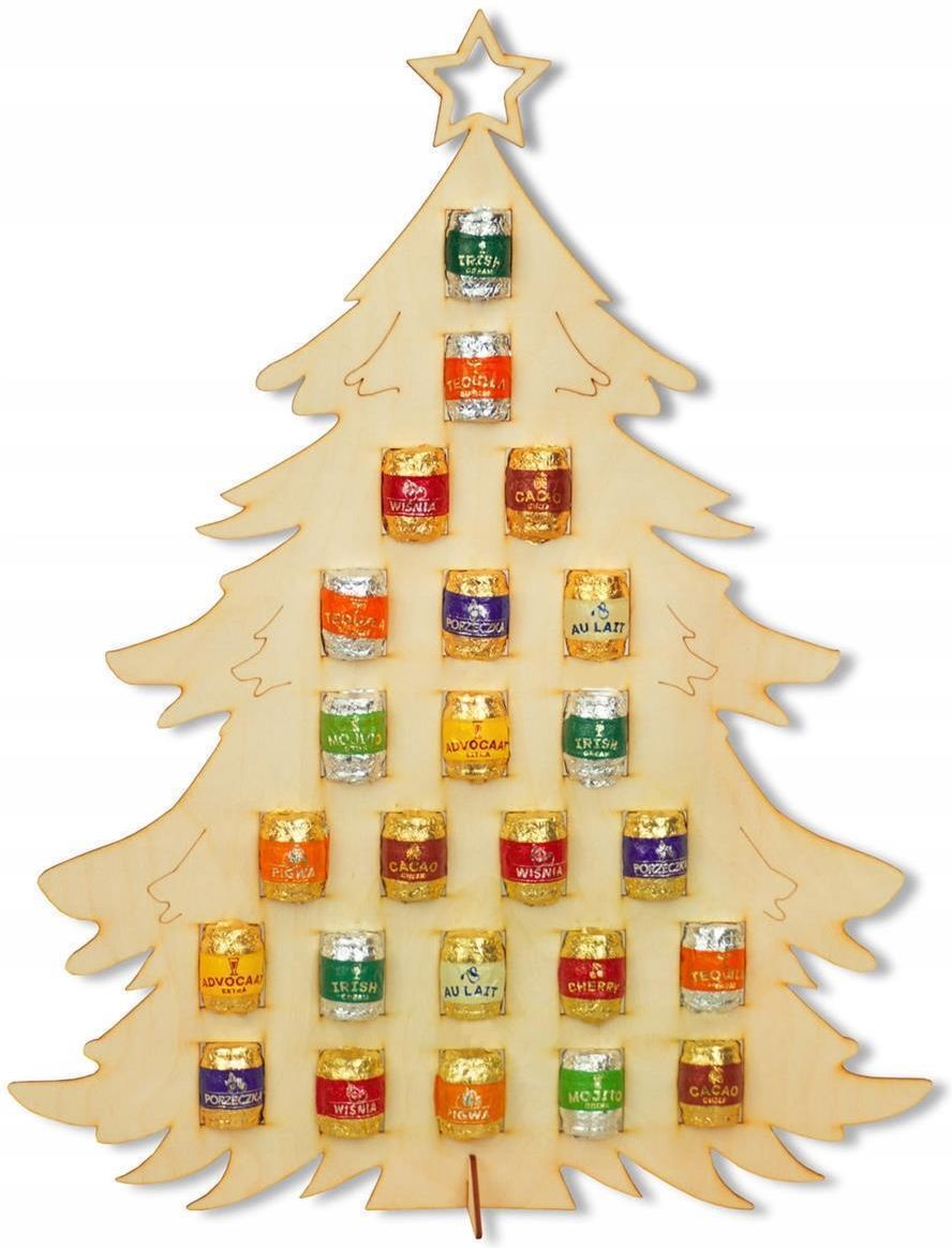Kalendarz adwentowy - CHOINKA z czekoladkami WEDEL + 24 baryłki z alkoholem Cudowny i słodki sposób na odliczanie dni do Bożego Narodzenia. Uwielbiasz Świąteczny nastrój w swoim domu? Odliczaj czas do świątecznych dni przy pomocy uroczego kalendarza z kształcie świątecznej Choinki i ułóż na niej 24 słodkie Niespodzianki! Odliczanie dni, za pomocą kalendarza adwentowego, to w wielu domach tradycyjna część grudniowego oczekiwania na Wigilię. Kalendarz adwentowy, w formie drewnianej choinki, który posiada specjalne miejsca do przechowywania Baryłek na każdej gałęzi. Świetnie sprawdzi się jako ozdoba Świąteczna w Twoim domu, podczas oczekiwania na Święta! Stylowa dekoracja w formie świątecznej choinki. Przeznaczona zarówno do dekoracji wnętrz, do tradycyjnego odliczania dni do Wigilii, oraz do przechowywania ulubionych Baryłek od Wedla. Nadaje Świąteczny klimat Posiada 24 dołączone Baryłki Wedel Oryginalny kalendarz adwentowy na każdy dzień Kalendarz przeznaczony jest do samodzielnego złożenia, a elementów nie trzeba sklejać! Wystarczy założyć nóżki i koszyczki - gotowe! Specjalnie zaprojektowane otwory i system mocowania umożliwiają szybkie złożenie. W zestawie znajduje się kalendarz choinka z podstawką oraz 24 Baryłki WEDEL z alkoholem w różnych smakach o gramaturze 20g Baryłki to połączenie unikalnej receptury i długoletniej tradycji. Wedlowska czekolada oraz gęste alkoholowe nadzienie wprowadzają w dobry nastrój. Dzięki idealnie dobranym składnikom Baryłki smakują zawsze tak samo wyjątkowo. To po prostu niepowtarzalny smak, kształt, atmosfera... Au lait Advocat Extra Cherry Cacao Choix Design: Piękna ozdoba na blat, stół czy półkę. Umili oczekiwanie na cudowny czas Świąt Bożego Narodzenia i zapewni codzienną radość z odkrywania prezentów. Wygrawerowane liczby na każdej z gałązek wyznaczają dzień odkrycia prezentu. Elementy mogą być malowane farbami, pisakami lub wyklejane metodą decoupage. Idealny pomysł na prezent z okazji Mikołajek. Specyfikacja: wymiary - szerokość: 40 cm / wysokość: 52 cm nóżka: 15 cm grubość materiału 3 mm materiał: sklejka brzozowa kolor: naturalne niemalowane drewno 24 ponumerowane otwory na baryłki 24 baryłki Wedel z alkoholem w różnych smakach Z grawerunkiem produkcja Polska Kalendarze zawsze są starannie zapakowane i zabezpieczone, by nie uległy zniszczeniu podczas transportu.