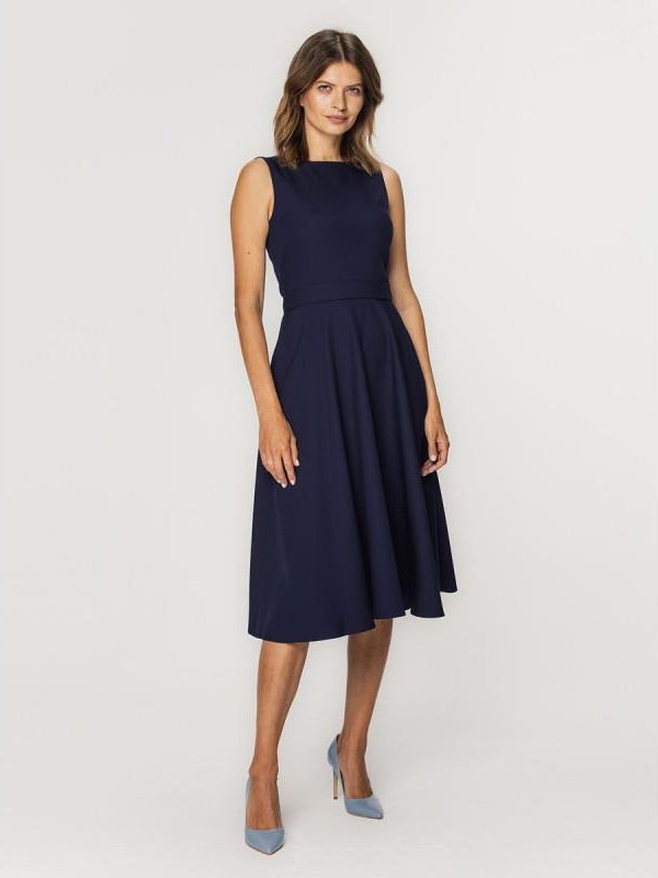 Rozkloszowana sukienka MIDI Rozkloszowana sukienka o długości midi, uszyta z pełnego koła, świetnie sprawdzi się zarówno do pracy, jak i na różnego rodzaju imprezy okolicznościowe. Szerokie ramiączka, zabudowane plecy i dekolt w kształcie łódki dodają sukience elegancji oraz klasy. Forma sukienki i pasek wiązany w talii doskonale modelują sylwetkę, nadając jej kształt klepsydry. Sukienka jest zapinana na zamek błyskawiczny umieszczony na plecach. Kolor główny: granatowa o gładkiej fakturze Rodzaj sukienki: rozkloszowana, długość MIDI Skład tkaniny wierzchniej: 57% wiskoza, 40% poliester, 3% elastan Skład podszewki: 98% poliester, 2% elastan Gwarancja: 24 m-ce Uszyto w Polsce