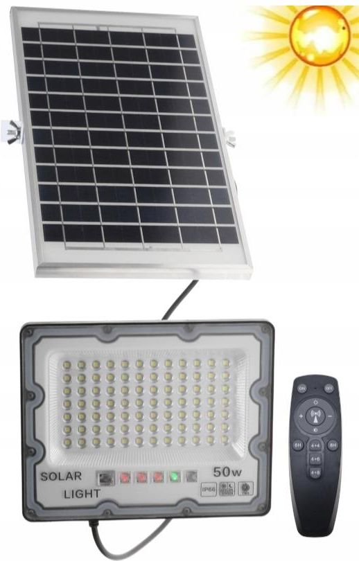 Halogen 50 W z panelem solarnym Ekologiczny i energooszczędny sposób oświetlenia Cechy produktu: Lampa o mocy 50 W Najnowszej generacji panelsolarny monokrystaliczny - silikonowy zapewnia ładowanie akumulatora nawet w pochmurne dni. Akumulator o sprawia, że latarnia świeci całą noc - w zależności od pogody. Czujnik zmierzchu (w solarze) załączy lampę po zmroku i wyłączy o świcie. Idealnie oświetli parking, plac budowy, ulicę, alejkę parkową. Nadaje się przed garaż, magazyn, w gospodarstwach rolnych i agroturystyce. Obudowa z tworzywa Dwa pojemne akumulatory 18650 Barwa świecenia: biała zimna Diody LED - 84 szt. Wodoszczelność wg. normy IP66 Długość kabla pomiędzy lampą, a panelem solarnym: ok. 2,5 m Wskaźnik naładowania baterii - 5 diod świecących na czerwono i zielono Solarny panel jest odporny na warunki atmosferyczne. Trwałość tego panelu krzemowego najnowszej generacji jest dużo większa niż większość lamp tego typu które posiadają panele amorficzne, niestety mniej trwałe i mniej wydajne. Lampa posiada regulację mocy świecenia Wymiary lampy: 19 x 15,5 x 4,5 cm Wymiary panelu : 29,5 x 17,5 cm Funkcje pilota: ON - włączenie lampy OFF - wyłączenie lampy Pełne "słoneczko" - pełna mocy świecenia Połowa "słoneczka" - połowa mocy świecenia "+" - zwiększenie mocy świecenia, działa podczas wszystkich trybów czasowych "-" - zmniejszenie mocy świecenia, działa podczas wszystkich trybów czasowych 6H - lampa świeci przez 6 godzin 8H - lampa świeci przez 6 godzin 4+4 - Przez pierwsze 4 godziny lampa świeci z pełną mocą, przez kolejne 4 godziny świeci z minimalną mocą 4+6 - Przez pierwsze 4 godziny lampa świeci z pełną mocą, przez kolejne 6 godzin świeci z minimalną mocą 4+8 - Przez pierwsze 4 godziny lampa świeci z pełną mocą, przez kolejne 8 godzin świeci z minimalną mocą