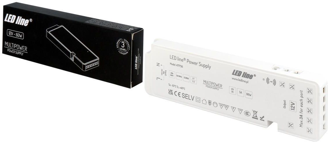 LED line® Multipower 100-12 8,3A 100W 12V IP20 LED line 477743 Klasa szczelności IPWspółczynnik mocy PFTemperatura pracyKlasa ochrony przed porażeniem elektrycznym Zasilacz LED line® Multipower 100W 12V przeznaczony jest do zastosowania w rozbudowanych instalacjach opartych o taśmy LED. Ideą pracy zasilacza jest sterowanie równocześnie lub osobno w zależności od preferencji użytkownika poszczególnymi odcinkami oświetleniowymi lub źródłami światła LED. Zasilacz ma bardzo smukły kształt, co umożliwia jego instalację nawet w trudnodostępnych miejscach. Instalacja zasilacza jest bardzo łatwa dzięki zintegrowanemu systemowi Plug&Play . Montaż i podłączenie zasilacza nie wymaga dodatkowego okablowania. Wszystkie podzespoły zasilacza posiadają złącza DuPoint, które pracują na zasadzie Plug& Play. Konstrukcja zasilacza o głębokości zaledwie 18-20 mm pozwala na jego łatwe ukrycie podczas instalacji. Produkt posiada wymiary: 147 mm x 55 mm x 18 mm. Napięcie wyjściowe: 12V. Zasilacz posiada moc 100W oraz 7 kanałów wyjściowych na czujniki. Zasilacz LED line® Multipower pozwala na wiele możliwości – sterowanie każdym kanałem zasilacza oddzielnie lub zbiorczo całym zasilaczem i jego wszystkimi obwodami jednocześnie, poprzez jeden, wybrany czujnik. Montaż czujników nie wymaga dodatkowego okablowania. Czujniki scalone są razem z przewodem i gotowe do podpięcia bezpośrednio do zasilacza i źródła światła LED. Sterowanie wszystkimi kanałami zasilacza jednocześnie można realizować przez jeden z wybranych czujników na kanale Master. Sterowanie poszczególnymi kanałami zasilacza odbywa się poprzez zastosowanie odpowiedniego czujnika na poszczególnym kanale wyjściowym zasilacza. Istnieje możliwość łączenia czujników w pary. Przykładowo można zamontować czujnik na kanale master, który będzie pełnił rolę nadrzędną pracy zasilacza współpracując z czujnikami zamontowanymi na każdym kanale wyjściowym zasilacza. Zasilacze posiadają zabezpieczenie przed zwarciem, przeciążeniem i przepięciem. Są idealne do zasilania niskonapięciowych instalacji o niskim poborze mocy. Istnieje możliwość montażu zasilacza również na powierzchniach łatwopalnych. Produkt zyskał certyfikaty: CE , LVD EN62368-1, EMC EN55032, RoHS, CCC Zasilacz przeznaczony jest do użytkowania wewnątrz pomieszczeń. Klasa szczelności produktu – IP20. Obudowa produktu wykonana jest z poliwęglanu. Aby podłączyć zasilacz do sieci, niezbędny jest sprzedawany oddzielnie, kabel zasilający. Na produkt udzielana jest 3-letnia gwarancja producenta. Klasyfikacja GPC: 10005559 Status: Aktywny (w sprzedaży) Zawartość netto produktu: 1 Jednostka: szt Moc wyjściowa: 100W Napięcie wyjściowe: 12V Zakres prądu wyjściowego: 8.3A Klasa szczelności IP: 20 Ilość w opakowaniu zbiorczym: 44szt. Zakres napięcia wejściowego: AC 220-240V Zakres częstotliwości napięcia wejściowego: 50/60Hz Prąd znamionowy: 0,483 A Normy bezpieczeństwa: EN62368; EN55032 Sprawność: 85% Tolerancja napięcia: 5%+/- Wilgotność otoczenia: 10-90% Wytrzymałość izolacji: 12.6V Normy EMC: EN55015 Standard, EN61547 Standard Typ mocowania: Natynkowy Prąd rozruchowy (typ.): 102A @230V Możliwość ściemniania: Brak możliowści Współczynnik mocy PF: 0,9 Temperatura pracy: 25°C Klasa ochrony przed porażeniem elektrycznym: II Waga opakowania zbiorczego (kg): 13,5 Kod produktu: 477743