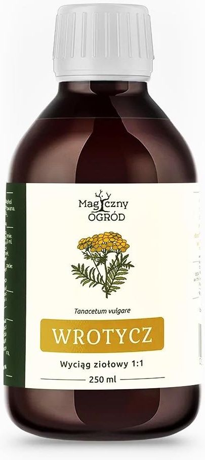 Magiczny Ogród WROTYCZ Nalewka 1:1 250ml Wrotycz ( Tanacetum vulgare) to roślina występująca w Europie i Azji, w Polsce jest dość powszechna. Wrotycz jest bardzo starym surowcem zielarskim o szerokim zastosowaniu. Jednak warto mieć na uwadze, że skład fitochemiczny wrotyczu może się różnić, ze względu na rejon występowania (istnieje wiele różnych chemotypów). SPOSÓB UŻYCIA Użyj miarkę lub dwie i wcieraj w miejsca zmienione. Do użytku zewnętrznego! SKŁAD Tinctura Tanaceti 1:1: kwitnące ziele wrotyczu, alkohol etylowy, woda, gliceryna roślinna PRZECIWWSKAZANIA Ciąża, karmienie piersią. Interakcje Nie stosować z lekami rozrzedzającymi krew. Bezpieczeństwo W badaniach na szczurach, którym podawano bardzo duże dawki (7g/kg masy ciała) liofilizowanego wodnego ekstraktu z liści wrotyczu nie zaobserwowano działań niepożądanych. Niewielkie efekty niepożądane pojawiły się dopiero przy zwiększeniu dawki do 9g/kg masy ciała. Tak jak każda substancja zażyta w nieodpowiednich ilościach, również preparaty wrotyczu mogą powodować objawy zatrucia. Objawy przedawkowania: nudności, wymioty, biegunka, kichanie, zaczerwienienie twarzy, wzdęcia, nadmierne pocenie się, zaburzenia rytmu serca, halucynacje. W moczu pojawia się białko i krew. Zawartość opakowania: 50ml Część rośliny:inne Tradycyjna medycyna:Europejska Zdrowie:Prawidłowa odporność, Wsparcie snu, Stres, napięcie, Trawienie Zastosowanie:Oczyszczanie organizmu, Trądzik Ostrzeżenia:Nie stosować w ciąży, Nie stosować podczas laktacji, Nie stosować u małych dzieci, Do użytku zewnętrznego, Silnie działający, Stosować rozcieńczony, Zawiera alkohol Producent:Nanga