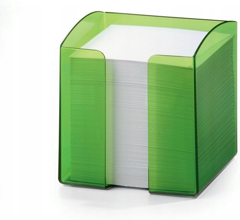 POJEMNIK Z KARTECZKAMI DURABLE ZIELONY 800 kart Durable Pojemnik na biurko z białymi karteczkami, z kolorowej kolekcji Trend. Doskonale komponuje sie z pozostałymi akcesoriami z tej kolekcji. Nowoczesny design i wykończenie z połyskiem sprawiają, że pojemnik bedzie ozdobą każdego biurka. Wykonanie z wysokiej jakości tworzywa zapewnia trwałośc na długi czas. Zestaw 800 karteczek,o rozmiarze 90x90mm, będzie zawsze pod ręką by umożliwić Tobie robienie szybkich notatek. długość: 105 mm głębokość: 100 mm ilość kartek: 800 jednostka sprzedaży: 1 kolor: transparentny zielony rodzaj kostki: nieklejona szerokość: 100 mm tworzywo: plastik klasa produktu: Premium