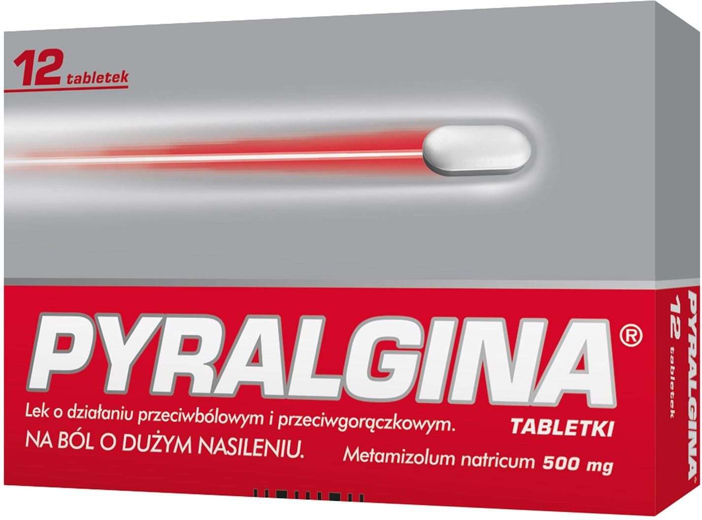 Pyralgina 500 mg x 12 tabl. Lek Pyralgina należy do nieopioidowych leków przeciwbólowych z grupy pochodnych pirazolonu o działaniu przeciwbólowym i przeciwgorączkowym.  Co to jest lek Pyralgina i w jakim celu się go stosuje? Lek Pyralgina należy do nieopioidowych leków przeciwbólowych z grupy pochodnych pirazolonu o działaniu przeciwbólowym i przeciwgorączkowym.  Działa również rozkurczowo na mięśnie gładkie. Lek Pyralgina wskazany jest w leczeniu:  bólu różnego pochodzenia o dużym nasileniu oraz gorączki, gdy zastosowanie innych środków jest przeciwwskazane lub nieskuteczne. Informacje ważne przed zastosowaniem leku Pyralgina Kiedy nie stosować leku Pyralgina:  jeśli pacjent ma uczulenie na metamizol, inne pochodne pirazolonu i pirazolidyny (np. propyfenazon, fenazon lub fenylobutazon) lub którykolwiek z pozostałych składników tego leku; jeśli u pacjenta występuje zespół astmy analgetycznej lub znana nietolerancja na leki przeciwbólowe objawiające się pokrzywką, obrzękiem naczynioworuchowym (obrzękiem w obrębie języka, twarzy, warg i (lub) gardła), tj. pacjenci, którzy reagują skurczem oskrzeli lub inną reakcją anafilaktoidalną na salicylany, paracetamol lub inne nieopioidowe leki przeciwbólowe, w tym niesteroidowe leki przeciwzapalne (NLPZ), takie jak: diklofenak, ibuprofen, indometacyna lub naproksen;  jeśli u pacjenta występują zaburzenia czynności szpiku kostnego (np. po zastosowaniu leków obniżających odporność organizmu) lub zmiany w obrazie morfologicznym krwi, takie jak zmniejszenie całkowitej liczby krwinek białych (leukopenia) lub pewnego rodzaju krwinek białych - granulocytów (agranulocytoza), lub niedokrwistość;  jeśli u pacjenta występuje ostra niewydolność nerek lub wątroby, ostra porfiria wątrobowa;  jeśli u pacjenta występuje wrodzony niedobór dehydrogenazy glukozo-6-fosforanowej (rzadka choroba dziedziczna);  jeśli pacjent stosuje lek z grupy pochodnych pirazolonu i pirazolidyny (np. fenylobutazon, propyfenazon);  jeśli pacjentka jest w ostatnich trzech miesiącach ciąży.  Ostrzeżenia i środki ostrożności  Przed rozpoczęciem stosowania leku Pyralgina należy omówić to z lekarzem lub farmaceutą: jeśli u pacjenta występuje skurczowe ciśnienie tętnicze mniejsze niż 100 mm Hg lub choroby serca i zaburzenia krążenia (np. zawał serca, choroba wieńcowa lub urazy wielonarządowe), zwężenie naczyń domózgowych, zmniejszona objętość krwi krążącej, a także u pacjentów odwodnionych, ponieważ lek może spowodować obniżenie ciśnienia tętniczego krwi;  jeśli pacjent ma wysoką gorączkę;  jeśli u pacjenta występuje niewydolność nerek i (lub) wątroby;  jeśli u pacjenta występuje choroba wrzodowa żołądka i dwunastnicy;  gdy pacjent ma astmę oskrzelową, w szczególności jeśli towarzyszy jej polipowate zapalenie błony śluzowej nosa i zatok;  gdy pacjent ma choroby uczuleniowe, w tym atopowe, przewlekłą pokrzywkę;  jeśli u pacjenta występuje nietolerancja niektórych barwników (np. tartrazyna) lub konserwantów (np. benzoesany);  u pacjentów z nietolerancją alkoholu objawiającą się kichaniem, łzawieniem oczu i silnym zaczerwienieniem twarzy w reakcji nawet na niewielkie ilości alkoholu; może to wskazywać na nierozpoznaną wcześniej astmę analgetyczną.  Ze względu na zagrożenie życia lek należy natychmiast odstawić i wezwać pomoc lekarską w razie wystąpienia objawów reakcji uczuleniowej (anafilaktycznej), np.: obrzęk twarzy, warg, języka i (lub) gardła, które mogą powodować utrudnienie połykania lub oddychania; ciężki skurcz oskrzeli, zmiany skórne i śluzówkowe, jak świąd, pieczenie, zaczerwienienie, pokrzywka; wstrząs (zmniejszenie ciśnienia tętniczego krwi, osłabienie, omdlenie). Pacjenci wykazujący reakcję uczuleniową lub inną immunologiczną reakcję na metamizol są także narażeni na podobną reakcję na inne pirazolony i pirazolidyny oraz inne nieopioidowe leki przeciwbólowe.  U pacjentów z uczuleniem może dojść do wstrząsu anafilaktycznego. Dlatego podczas stosowania leku zaleca się zachować szczególną ostrożność u pacjentów z astmą lub atopią (np. atopowe zapalenie skóry lub błon śluzowych, gorączka sienna, astma alergiczna). Pacjentom z podwyższonym ryzykiem wystąpienia reakcji podobnych do gwałtownych reakcji uczuleniowych metamizol wolno podawać tylko po starannym rozważeniu stosunku korzyści do ryzyka. Jeśli zajdzie taka konieczność należy podawać go w warunkach ścisłej kontroli lekarskiej, z zapewnieniem możliwości udzielenia pomocy w nagłym przypadku.  Lek należy natychmiast odstawić i zgłosić się do lekarza w razie wystąpienia objawów:  agranulocytozy, np. podwyższonej temperatury ciała połączonej z dreszczami, bólem gardła, trudnościami w połykaniu i owrzodzeniami w jamie ustnej, nosa, gardła, narządów płciowych i odbytnicy.  Stosowanie leku w dużych dawkach lub długotrwale zwiększa ryzyko agranulocytozy, dlatego lek nie powinien być stosowany dłużej niż 7 dni.  W razie konieczności długotrwałego stosowania leku lekarz bezwzględnie zaleci wykonanie badań oceniających morfologię krwi, gdyż metamizol może powodować uszkodzenie szpiku kostnego.  Pacjenci, u których wystąpiła agranulocytoza w odpowiedzi na leczenie metamizolem, są szczególnie narażeni na wystąpienie podobnej reakcji na stosowanie innych pirazolonów i pirazolidyny.  małopłytkowości, np.: wybroczyny na skórze i błonach śluzowych, krwiaki, nawracające krwawienia z dziąseł, nosa, przewodu pokarmowego;  pancytopenii (znaczne zmniejszenie ilości wszystkich komórek krwi: czerwonych i białych 3 krwinek oraz płytek krwi), np.: ogólne złe samopoczucie, gorączka, objawy zakażenia, krwiaki, krwawienia, bladość;  ciężkiej choroby alergicznej - zespołu Stevensa-Johnsona: pęcherze i nadżerki na skórze, w jamie ustnej,