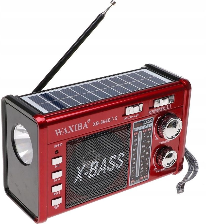RADIO PRZENOŚNE z latarką i PANELEM SOLARNYM "WAXIBA" NOWA DOSTAWA ! NOWE KOLORY DO WYBORU Idealne nadaje się do słuchania w domu oraz na wyprawy terenowe, obozy, camping czy pod namiot. Zasilane przez baterie lub sieciowo 230V. Słuchanie muzyki to jeden z najmilszych sposobów jak uprzyjemnić sobie chwile spędzane w domu i nie tylko. Ulubione utwory poprawiają nasz humor i koją nerwy już po pierwszych kilku nutach. Wybór odbiornika radiowego to dziś trudne zadanie, ponieważ na rynku istnieje wiele modeli wyposażonych w rozmaite udogodnienia, które czynią słuchanie muzyki profesjonalnym hobby. SPECYFIKACJA Włącznik z płynną regulacją głośności Obudowa z tworzywa Wbudowany Panel solarny który ładuje akumulator w słoneczne dni Tuner wbudowany w urządzenie umożliwia odbiór fal z pasm FM, AM oraz SW Regulator dostrojenia Wymienny akumulator (ogniowo 18650) Funkcja Bluetooth - możliwość połączenia np. z telefonem Wejście na kartę TF Wejście USB 2.0, możliwość odtwarzania plików mp3 Kabel USB w zestawie Antena teleskopowa Z boku radio posiada latarkę LED Wymiary: 18 x 11 x 8 cm PANEL SOLARNY Kolory obudowy radia : czarny, złoty, czerwony Szanowni klienci: jeśli kolor korpusu radia ma znaczenie prosimy o informację w wiadomości do sprzedającego, brak wiadomości oznacza kolor losowy, dziękujemy za wyrozumiałość :)