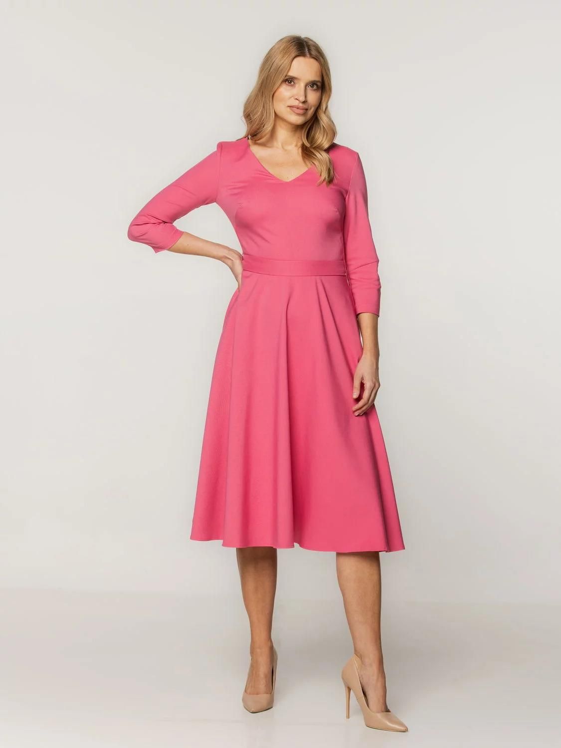 Rozkloszowana sukienka MIDI Elegancka sukienka MIDI z rozkloszowanym dołem i dekoltem w serek (typu V). Sukienka posiada rękaw 3/4 i jest zapinana na plecach za pomocą zamka błyskawicznego. Charakterystycznymi cechami tego modelu są dwie kieszenie oraz pasek, który można wiązać na wiele sposobów. Sukienka świetnie kamufluje niedoskonałości figury, a dzięki paskowi w talii tworzy piękną, klepsydrową sylwetkę. Kolor główny: różowa o gładkiej fakturze Długość rękawów: 3/4 Rodzaj sukienki: rozkloszowana, długość MIDI, dekolt w serek (typu V) Skład tkaniny wierzchniej: 37% wiskoza, 59% poliester, 4% elastan Skład podszewki: 94% poliester, 6% elastan Wyprodukowano w Polsce Gwarancja: 24 m-ce