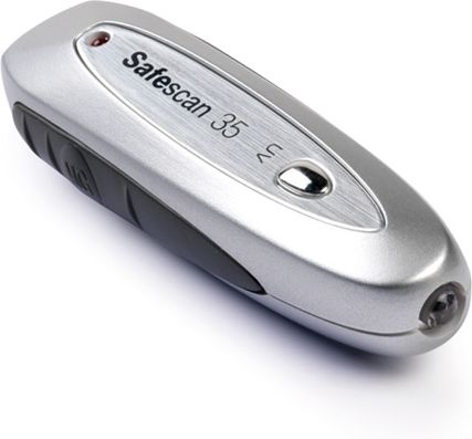 SAFESCAN 35 Grey Suitable for Banknotes, ID documents Number of detection points 3Opis ogólny: kolor - Grey : Producer product name - 35 Technical details: Number of detection points - 3 Value counting - No Producer - SAFESCAN Design: Odpowiedni dla - Banknotes, ID documents Opis ogólny / Model: Counterfeit checking pen Opis ogólny / kolor: Grey Technical details / Inne funkcje: Threefold verification (UV, magnetic characteristics and security thread) for reliable results,Extremely lightweight and compact,Quick and easy to use,Including neck strap Technical details / Number of detection points: 3 Technical details / Value counting: No Technical details / Net weight: 0.05 kg Technical details / Producer: SAFESCAN Producer product name: 35 Rodzaje detekcji: UV, magnetic characteristics and security thread Gross weight: 0.06 kg Warranty: 36 miesiąc Design / Odpowiedni dla: Banknotes, ID documents Package features / Packing quantity: 1.00 szt. Package features / Volume (m3): 0.00 m³ Package features / Tare weight (kg): 0.01 kg Package features / Gross depth (mm): 140.00 mm Package features / Gross width (mm): 85.00 mm Package features / Gross height (mm): 30.00 mm Package features / Embeeded battery: No Package features / WEEE tax: No Package features / Paper/Pasteboard: 10 g