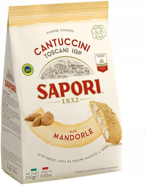 Ciastka włoskie Cantuccini Mandorle SAPORI 250 g. Ciastka kruche z migdałami włoskie Cantuccini Mandorle SAPORI 250 g. Sapori Cantuccini Toscani IGP z migdałami są wytwarzane z tą samą dbałością o jakość od wieków. Połączenie migdałów ze świeżymi jajami z wolnego wybiegu, świeżym mlekiem i miodem tworzy produkt, który zachwyca wszystkie zmysły. Ukośne cięcie to jedna z charakterystycznych cech cantuccini - są wykonywane na paluszkach ciasta wyjętych prosto z pieca. To, co wyróżnia cantuccini SAPORI to podwójny proces pieczenia: po nacięciu są one pieczone ponownie, dzięki czemu stają się jeszcze bardziej chrupiące. Składniki: Mąka pszenna, cukier, migdały 20%, świeże żółtko jaja z wolnego wybiegu 4,8%, świeże jaja z wolnego wybiegu 4,8%, świeże pasteryzowane pełne mleko 4,8%, masło, miód 0,5%, substancje spulchniające: difosforan disodowy – wodorowęglan sodu, sól, aromaty. Produkt może zawierać soję, nasiona sezamu i inne orzechy. Wartości odżywcze w 100 g produktu: Wartość energetyczna 1945 kJ/463 kcal; Tłuszcze 18 g w tym kwasy tłuszczowe nasycone 4,3 g, Węglowodany 63 g w tym cukry 32 g; Błonnik 4,7 g, Białko 10 g; Sól 0,75 g. Waga netto: 200 g Opakowanie: plastykowy kubeczek z pokrywką (do recyklingu ♻️) Kraj produkcji: Włochy Termin przydatności: najlepiej spożyć do 05.05.2026 Sposób przechowywania: przechowywać w temperaturze otoczenia w przewiewnym i suchym miejscu