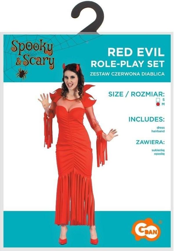 STRÓJ CZERWONA DIABLICA W skład stroju wchodzi: sukienka, opaska Rozmiar: M Kolor: czerwony Materiał: 100% poliester Producent: Godan