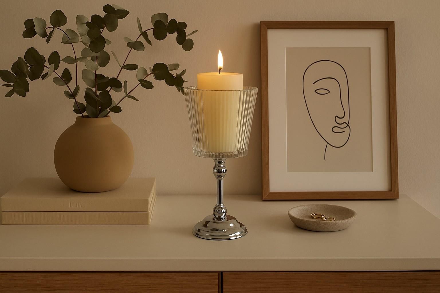 Elegancki świecznik szklany to wyjątkowy dodatek, który wprowadzi do wnętrza nastrojowe światło i stylowy akcent dekoracyjny. Wykonany z ryflowanego szkła w połączeniu z metalową, chromowaną podstawą, prezentuje się niezwykle szykownie i ponadczasowo. Świecznik idealnie sprawdzi się zarówno jako ozdoba salonu, jadalni czy sypialni, jak i podczas wyjątkowych okazji – romantycznej kolacji, świąt czy przyjęcia weselnego. Jego klasyczny kształt i połyskujące wykończenie pasują do aranżacji w stylu glamour, klasycznym, nowoczesnym oraz eleganckim vintage. Dzięki stabilnej podstawie świecznik jest bezpieczny w użytkowaniu, a szklana osłona pięknie rozprasza światło świecy, tworząc przyjemny i ciepły nastrój. Świetnie sprawdzi się jako dekoracja sal weselnych, przyjęć i eleganckich bankietów, dodając im klasy i romantycznego klimatu. Wymiary: wysokość: 27,5 cm średnica: 13 cm Najważniejsze cechy: eleganckie połączenie szkła i metalu ryflowane szkło dodające blasku i lekkości stabilna, chromowana podstawa idealny do wnętrz glamour, klasycznych i nowoczesnych piękna dekoracja stołu, komody lub konsoli Postaw na świecznik, który zachwyci gości i odmieni każde wnętrze, nadając mu wyjątkowego charakteru. Zdjęcia aranżacyjne mają charakter poglądowy. Prezentowana aranżacja może zawierać elementy dekoracyjne niewchodzące w skład zestawu. Szczegóły dotyczące zawartości znajdują się w opisie produktu.