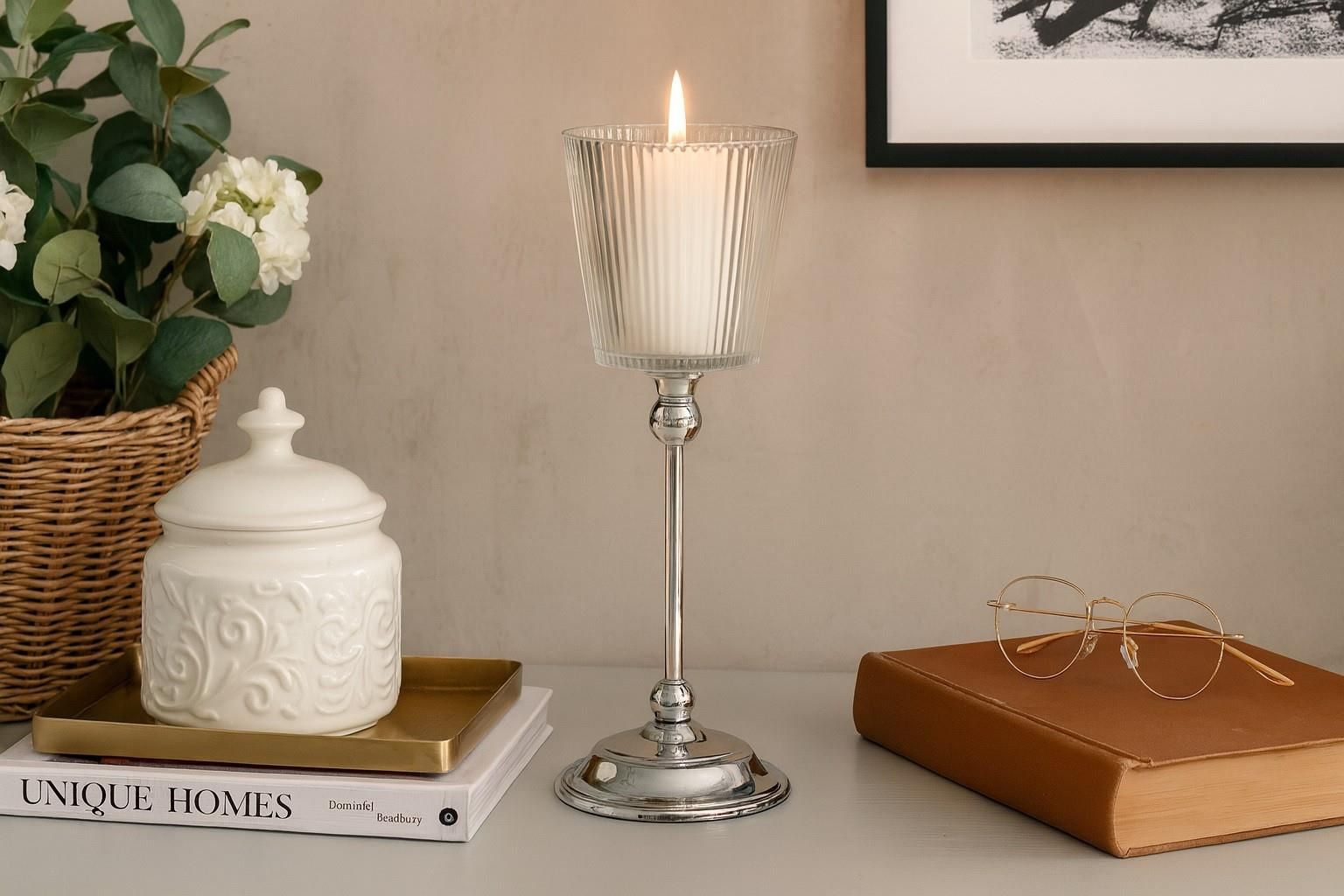 Elegancki szklany świecznik to wyjątkowa dekoracja, która doda blasku każdemu wnętrzu. Wykonany z połączenia transparentnego szkła z delikatnymi żłobieniami i stabilnej, metalowej podstawy w kolorze srebra, zachwyca ponadczasowym designem. Dzięki swojej wysokości doskonale prezentuje się zarówno z …