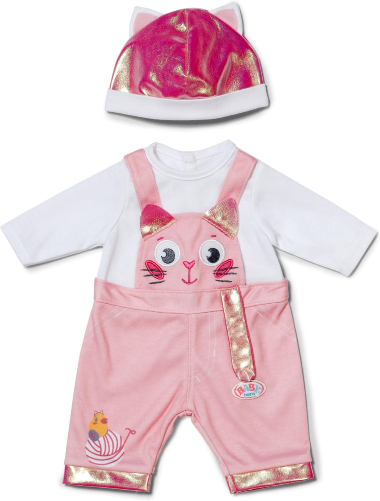 In this jumpsuit with kitten print, long sleeves, and overall-style design, BABY born becomes a little, cuddle-ready kitten. The matching hat features adorable cat ears and completes the outfit. On the pant leg, Berta the duck is already playing with a ball of yarn. Will Cookie the kitten join in too? High-quality accessories for BABY born. Offers even more variety for long-lasting, fun play. Ages 3+ Includes: BABY born jumpsuit and hat, 43 cm