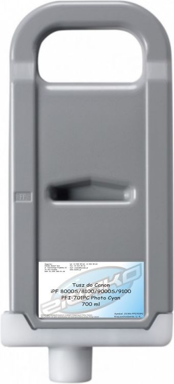 Bardzo dobrej jakości tusz zamienny do Canon iPF8000S/8100/9000S/9100 700 ml Photo Cyan sprawdzony i posiadający gwarancje. Nie uszkadza głowic. Bezproblemu można mieszać te tusze z oryginalmymi, nie pawodując żadnych skutków ubocznych. Odpowiednik tuszu Canon PFI-701PC Photo Cyan zalety tuszy zizaKo do Canon iPF8000S/8100/9000S/9100 * Doskonała jakość farb, bardzo krótki czas schnięcia * Możliwość wymieszania z tuszami Canon * Można stosować oryginalny papier i folie Canon Pojemność: 700 ml Pasuje do: iPF8000S iPF8100 iPF9000S iPF9100
