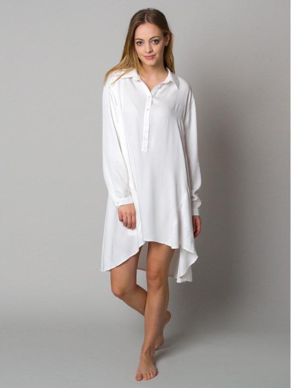 Asymetryczna koszula nocna Elegancka koszula nocna mająca formę przedłużonej koszuli. Koszula ma krój oversize oraz długie rękawy, których mankiety są wykończone przezroczystymi guzikami. Koszula nie prześwituje, co daje możliwość noszenia jej na wiele sposobów. Koszula jest wykonana ze 100% wiskozy, dzięki czemu jest bardzo delikatna w dotyku. Wiskoza jest materiałem produkowanym z surowców naturalnych, który jest poddawany obróbce technologicznej. Tkanina pod względem wizualnym przypomina jedwab, który jest delikatny i lejący się, dodatkowo świetnie absorbuje wilgoć i jest niesamowicie przyjazna dla skóry. - Kolor główny: ecru - Długość: MIDI - Cechy: krój oversize, długie rękawy, asymetryczna długość - Skład: 100% wiskoza - Wyprodukowano w Polsce