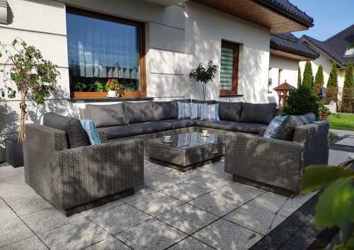 Wybarwienie kompletu można zobaczyć na ekspozycji sklepu stacjonarnego. BelGiardino - meble ogrodowe z technorattanuDzięki zdobytemu na przestrzeni lat doświadczeniu jesteśmy w stanie dostarczyć główne elementy aranżacji ogrodów, tarasów oraz balkonów. Z roku na rok staramy się dopracowywać naszą kolekcję, odpowiadając na potrzeby klientów i zmieniające się trendy. Polecamy wysokiej jakości meble ogrodowe z technorattanu, które w każdej chwili dostosować można do aktualnych potrzeb. Skład kompletu jeden stolik prostokątny z blatem z hartowanego szkła o grubości 5mm; jeden element środkowy z poduszkami w kolorze GRAFIT i o grubości 10cm; dwa elementy kończące z poduszkami w kolorze GRAFIT i o grubości 10cm; jeden narożnik z poduszkami w kolorze GRAFIT i o grubości 10cm; jeden fotel z poduszkami w kolorze GRAFIT i o grubości 10cm; opcjonalne dwa dodatkowe fotele; opcjonalne dwa dodatkowe podnóżki; opcjonalny dodatkowy pokrowiec w kolorze GRAFIT. Zalety kompletu odporność na działanie promieni UV; odporność na warunki atmosferyczne; elegancka plecionka; niepowtarzalne wzornictwo; wzmocniona konstrukcja stelaża; rama aluminiowa, malowana proszkowo; dodatkowe wzmocnienia zapewniają długotrwałą wygodę i komfort użytkowania mebli ogrodowych. Materiały i wykonanieKomplet mebli ogrodowych CALABRIA marki BelGiardino jest wykonany z PÓŁOKRĄGŁEGO technorattanu w kolorze SZARY i o grubości 6mm, który jest doskonałą imitacją naturalnego rattanu. lekkie stelaże są wykonane z aluminium malowanego proszkowo; konstrukcja mebli ogrodowych jest ręcznie opleciona wspomnianym rattanem PE, co potęguje efekt naturalności; technorattan cechuje się wyjątkową lekkością oraz wytrzymałością na warunki atmosferyczne, takie jak deszcz i śnieg; dzięki zastosowaniu nowego, syntetycznego materiału uzyskano doskonałą jakość oraz wytrzymałość; w komplecie znajdują się poduszki, które wytworzono z wodoodpornego materiału. Zapewniają one komfortowe użytkowanie zestawu; wszystkie pokrowce na poduszki są zaimpregnowane, dzięki czemu są odporne na warunki atmosferyczne oraz poplamienia, dzięki czemu przypadkowo wylane napoje nie stanowią już żadnego problemu; zastosowany zamek błyskawiczny daje możliwość szybkiego zdjęcia i wyczyszczenia każdej poszewki. UwagaW wyniku działania promieni słonecznych oraz wysokich temperatur może występować efekt "falującego" rattanu na blacie stołu. Dzieje się tak z powodu skupiania energii słonecznej przez szybę. Efekt ten jest odwracalny - obniżenie temperatury skutkuje natychmiastowym powrotem do pierwotnego stanu. Zalecamy ustawić zestaw pod zadaszeniem lub w zacienionym miejscu.