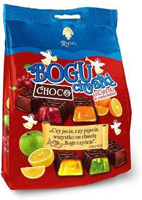 Inspiracją do powstania BOGUchwałek była zachęta św. Pawła, by wszystko, co robimy, czynić na chwałę Bożą! Niech zatem Pawłowa zachęta, którą każdy, kto sięgnie po BOGUchwałki, znajdzie zawsze na owijce, stanie się życiowym mottem, a smak BOGUchwałek wzbudza radość, przyjemność i uśmiech. Na Bożą chwałę oczywiście! Boguchwałki CHOCO – galaretki w czterech smakach owocowych (pomarańczowym, wiśniowym, cytrynowym i jabłkowym) ukryte pod aksamitną czekoladą. Czekolada deserowa zawiera 46% masy kakaowej. Produkt zawiera koncentraty soków owocowych, naturalną substancję żelująca (pektyna). Galaretki bez konserwantów, bez glutenu. Odpowiednie dla wegan i wegetarian. Waga: Paczka 230g