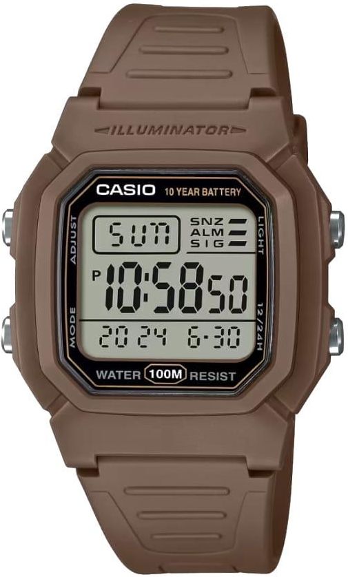 CASIO W-800H-5A Zegarki to niezwykle funkcjonalne i stylowe akcesoria, które łączą w sobie praktyczność i estetykę. Wybór odpowiedniego modelu może być kluczowy dla podkreślenia osobistego stylu oraz dostosowania go do codziennych potrzeb. Wśród dostępnych opcji, męski model CASIO W-800H-5A wyróżnia się nowoczesnym designem i bogatą funkcjonalnością. Typ zegarka Ten męski zegarek to cyfrowy model, który łączy nowoczesne technologie z klasycznym stylem. Zegarki cyfrowe zyskują coraz większą popularność, zwłaszcza wśród osób aktywnych. Dzięki wyraźnemu wyświetlaczowi i prostemu odczytowi godziny, ten model jest idealnym rozwiązaniem dla tych, którzy cenią sobie wygodę i funkcjonalność. Oprócz podstawowej funkcji wskazywania czasu, oferuje szereg dodatkowych opcji, które mogą znacznie ułatwić codzienne życie. Mechanizm Mechanizm kwarcowy, na którym oparty jest ten zegarek, to doskonały wybór dla osób poszukujących precyzyjnego i niezawodnego rozwiązania. Zasilany baterią, zapewnia długotrwałą pracę, co sprawia, że użytkownicy nie muszą regularnie martwić się o wymianę źródła zasilania. Mechanizmy producenta Casio znane są z wysokiej dokładności, co czyni ten model jeszcze bardziej atrakcyjnym. Materiał koperty Koperta zegarka wykonana jest z wysokiej jakości tworzywa sztucznego, co sprawia, że jest lekka i jednocześnie wytrzymała. Dzięki temu model doskonale sprawdza się w różnych warunkach, zarówno podczas codziennego użytkowania, jak i w czasie aktywności na świeżym powietrzu. Brązowy kolor koperty dodaje elegancji i sprawia, że zegarek pasuje do wielu stylizacji. Szkiełko Szkiełko akrylowe zastosowane w modelu charakteryzuje się wysoką przejrzystością oraz odpornością na uszkodzenia. Choć akryl jest nieco bardziej podatny na zarysowania niż szkło mineralne czy szafirowe, to jego niska waga i łatwość w wymianie sprawiają, że jest popularnym wyborem w zegarkach sportowych. Użytkownicy mogą cieszyć się doskonałą widocznością, a przy tym nie obawiać się o ciężar zegarka na nadgarstku. Wodoszczelność Model CASIO W-800H-5A cechuje wodoszczelność na poziomie 100 m (10 BAR), co oznacza, że jest odpowiedni do pływania i nie tylko. Taki poziom odporności na wodę sprawia, że zegarek jest idealny dla osób aktywnych, które uprawiają sporty wodne, a także dla tych, którzy cenią sobie niezawodność w codziennych sytuacjach, takich jak deszcz czy zachlapanie. Wymiary zegarka Wymiary zegarka są istotnym aspektem, na który warto zwrócić uwagę przy wyborze modelu. Zegarek ma następujące wymiary: szerokość koperty to 44 mm, wysokość to 40 mm, a grubość to zaledwie 14 mm. Taki rozmiar sprawia, że doskonale leży na nadgarstku, a jego kwadratowy kształt dodaje nowoczesnego charakteru. Pasek lub bransoleta Model wyposażony jest w wytrzymały pasek wykonany z tworzywa sztucznego, który łączy w sobie wygodę noszenia z estetyką. Jego długość wynosi 190 mm, a szerokość to 18 mm, co czyni go odpowiednim dla większości mężczyzn. Dodatkowo, pasek zakończony jest solidnym zapięciem, co zapewnia pewność noszenia. Funkcje dodatkowe Warto zwrócić uwagę na funkcje dodatkowe, które oferuje ten model. Oto niektóre z nich: Alarm – możliwość ustawienia jednego alarmu na dzień, Datownik – wyświetla aktualną datę oraz nazwę dnia, Podświetlenie – dioda LED pozwala na wygodne odczytywanie godziny w warunkach słabego oświetlenia, Stoper – maksymalny czas pomiaru wynosi 24 godziny, Podwójny czas – zegarek może jednocześnie wskazywać czas w dwóch strefach czasowych. Te funkcje są szczególnie przydatne dla osób prowadzących aktywny tryb życia, umożliwiając dokładne śledzenie czasu oraz organizację codziennych zadań. Styl i design Model CASIO W-800H-5A ma sportowy charakter, co czyni go doskonałym wyborem dla mężczyzn, którzy cenią sobie aktywność i luz w codziennym stylu. Połączenie różnych kolorów i nowoczesny kwadratowy kształt tworzą harmonijną całość, która doskonale wpisuje się w różnorodne okazje – zarówno podczas codziennych wyjść, jak i w bardziej formalnych sytuacjach. Funkcjonalny design sprawia, że zegarek jest zarówno estetyczny, jak i praktyczny. Gwarancja Zegarek objęty jest 3-letnią gwarancją, co stanowi standard w branży zegarków. Gwarancja to ważny aspekt, który zapewnia użytkowników o jakości i niezawodności produktu, oferując dodatkowe zabezpieczenie na wypadek ewentualnych problemów.