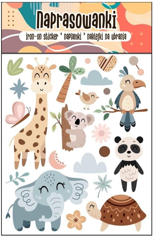 Naprasowanki, Naplamki, Termo Naklejki na Ubrania DTF - Zwierzątka z Dżungli Zestaw grafik w postaci naprasowanek prezentujący zabawne Zwierzątka z Dżungli, czyli żyjące w Afryce, czy Australii. Naprasowanki, naplamki, naklejki na gorąco to profesjonalny produkt do użytku w domu. To ozdobne aplikacje, wzory lub grafiki wykonane na specjalnej folii, które można w prosty sposób przenieść na tkaninę za pomocą żelazka lub prasy termicznej. Proces ten pozwala na uzyskanie wysokiej jakości nadruków, które są trwałe, elastyczne i odporne na wielokrotne pranie. Świetnie sprawdzają się jako ozdoba lub łatka zakrywająca niespieralne plamki lub drobne uszkodzenia. Dzięki rewolucyjnej metodzie druku DTF możliwe jest tworzenie trwałych i precyzyjnych nadruków na różnych rodzajach materiałów, od bawełny po poliester. Wytnij wybrany przez ciebie wzór, umieść w dowolnym miejscu, przyprasuj i ciesz się wspaniałą ozdobą. Arkusz o rozmiarach 14,5 cm x 19,5 cm. Wymiar największej aplikacji ok. 11 cm x 4,5 cm. Możliwość tworzenia kompozycji poprzez dowolne łączenie kilku elementów z arkusza. Idealne do ozdabiania koszulek, bluz, poduszek, toreb, itp. Wzór drukowany systemem DTF dzięki czemu: Grafika zachowuje swoją jakość i wygląd nawet po rozciągnięciu materiału. Jest trwała i odporne na wielokrotne pranie i rozciąganie. Umożliwia przenoszenie skomplikowanych grafik z drobnymi detalami. Metoda pozwala na przeniesienie druku na praktycznie wszystkie rodzaje materiałów. Instrukcja aplikacji w warunkach domowych: Wyczyść i wyprasuj materiał, na którym chcesz umieścić nadruk. Umieść nadruk w wybranym miejscu. Miejsce nadruku ma być na twardej powierzchni. Przyłóż papier pergaminowy (papier do pieczenia). Przyłóż żelazko (ok. 150 stopni, bez pary) i delikatnie przez 15 do 20 sekund przyciskaj do aplikacji (nacisk średni). Starannie dociśnij brzegi nadruku. Ściągnij papier pergaminowy i odczekaj 2-3min aż nadruk ostygnie, a następnie delikatnie ściągnij folie z nadruku. Jeśli nadruk nie trzyma się, przyłóż papier pergaminowy i dociśnij jeszcze raz przez 10-15 sekund. Uwaga: wgrzanie jest trwałe. Nie ma możliwości poprawienia. Kategoria wiekowa: 3+. Uwaga: Używać zgodnie z przeznaczeniem. Stosować tylko pod nadzorem osoby dorosłej. Stosowanie żelazka może powodować oparzenia. Małe elementy, możliwość zakrztuszenia. Nie stosować na skórę. Zachowaj ostrożność przy zdejmowaniu folii transportowej - odczekaj aż ostygnie i rób to powoli, żeby uniknąć uszkodzeń nadruku. Pielęgnacja: Prać na lewej stronie, w temperaturze do 30C. Nie stosować suszarki bębnowej. Nie stosować silnych detergentów ani środków wybielających. Zawsze prasować po lewej stronie w temperaturze max 150 stopni. Porada: Jeśli chcesz umieścić kolejną naprasowankę obok już naklejonej, przykryj papierem do pieczenia poprzednią, aby uniknąć prasowania bezpośrednio po już naklejonej.