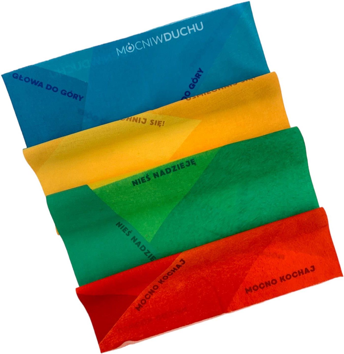Chusta 4 kolory wykonana z bezszwowego, elastycznego materiału. Wszechstronnego zastosowania - sprawdzi się jako opaska, czapka, piratka, chustka pod szyję, opaska na rękę, gumka do włosów itp. Żywe barwy i inspirujące napisy, które nawiązują do płyty dla dzieci pt. Kolory . Na głowę, na szyję, na włosy... Noszona, by uatrakcyjnić zbyt spokojny strój, jak i po to, żeby nam w uszy nad morzem nie nawiało. Dobry prezent dla dziecka, ale także dla lubiącego kolory dorosłego. Głowa do góry Uśmiechnij się! Nieś nadzieję Mocno kochaj Materiał: 100% poliester mikrofibra Gramatura: 140 g/m2 Rozmiar: 25 x 50 cm Nadruk: sublimacja
