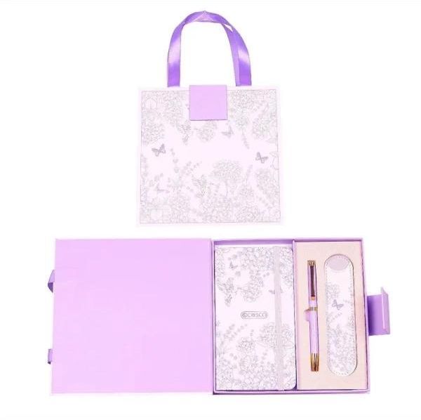 Zestaw prezentowy w ciekawym opakowaniu imitującym torebkę prezentową. Komplet zawiera notes z gumką i wstążką, długopis oraz etui skóropodobne na długopis. Zestaw upominkowy spakowany w kartonowe etui z zapięciem magnetycznym.