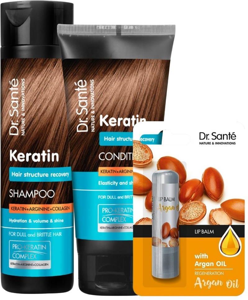 Dr. Santé Keratin, 3 szt., Zestawy kosmetyków dla kobiet, Nie możesz się zdecydować, jaką pielęgnacją włosów sprawić radość sobie lub swoim bliskim? Zaufaj nam, wybraliśmy najlepsze kosmetyki do włosów! Wybrane przez nas bestsellery znajdziesz w Discovery Box Dr. Santé Keratin , który pozwoli Ci odkryć i wypróbować nowe kosmetyki przed zakupem pełnowymiarowych produktów. W boksie znajdziesz 5 próbek z kategorii pielęgnacji włosów. Która z nich podbije Twoje serce? Zawartość zestawu: Dr. Santé Keratin odżywka regenerująca do włosów łamliwych i matowych 200 ml Dr. Santé Keratin szampon regenerująco-nawilżający do włosów łamliwych i matowych 250 ml Dr. Santé Argan balsam do ust 3.6 g Właściwości: głęboko nawilża i intensywnie odżywia chroni usta przed wpływami zewnętrznymi regeneruje popękane usta wzmacnia włókna włosów dodaje blasku i objętości wygładza włókna włosów naprawia uszkodzenia mechaniczne i chemiczne doskonały pomysł na prezent sprawi radość każdej kobiecie Sposób użycia: Stosuj każdy z produktów z zestawu zgodnie z załączoną do niego instrukcją.