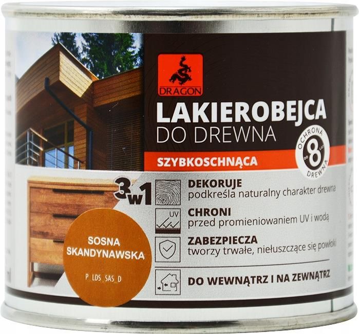 Dragon Lakierobejca do drewna Kolor: Sosna Skandynawska Pojemność: 200ml To wysokiej jakości produkt ochronno-dekoracyjny do zabezpieczenia drewna zarówno wewnątrz pomieszczeń jak i na zewnątrz. Dzięki zaawansowanej formule 3 w 1 idealnie sprawdzi się jako produkt, który impregnuje drewno, nadaje …