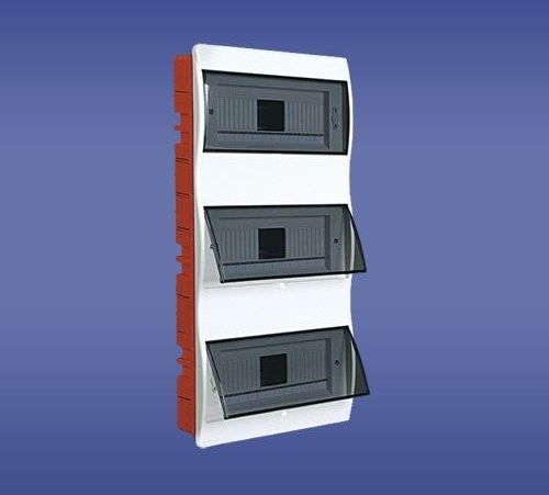 Rozdzielnica modułowa RP-36 PT IP40 8.6 EP_OPATÓWEK Rozdzielnice podtynkowe RP z serii Fala Line są przeznaczone do montażu modułowych aparatów elektrycznych w obiektach domowych, biurowych i gospodarczych. Stopień ochrony IP40 predestynuje je do stosowania tylko w pomieszczeniach czystych i suchych.Rozdzielnice RP Fala posiadają posiadają transparentne drzwiczki uchylne (góra-dół, wykonane z poliwęglanu PC, pokrywę z białego ABS oraz pomarańczową obudowę przystosowaną do wbudowania w ściany z materiałów trudnopalnych. W bocznych częściach obudowy występują przetłoczenia dla łatwego wprowadzenia przewodów bądź rurek instalacyjnych. Rozdzielnice zaopatrzone są w etykiety opisowe. Elementem montażowym dla aparatury jest wspornik TH 35/7,5 (Euroszyna, DIN). Pokrywa wierzchnia jest przystosowana do plombowania. Dane techniczne Głębokość [mm]: 108 Głębokość wbudowania [mm]: 84 Indeks producenta: 8.6 Kolor: Biały Liczba rzędów: 3 Materiał obudowy: Tworzywo sztuczne Możliwość rozbudowy: Nie Numer RAL: 9003 Rodzaj pokrywy: Zamknięte Seria produktu: RP Sposób montażu: Montaż podtynkowy Stopień ochrony (IP): IP40 Szerokość [mm]: 312 Szerokość wyrażona liczbą modułów: 12 Szyna DIN: Tak Wykonanie zgodne z Dyrektywą Kompatybilności Elektromagnetycznej EMC: Nie Wysokość [mm]: 605 Z płytą montażową: Nie Z pokrywą transparentną: Tak