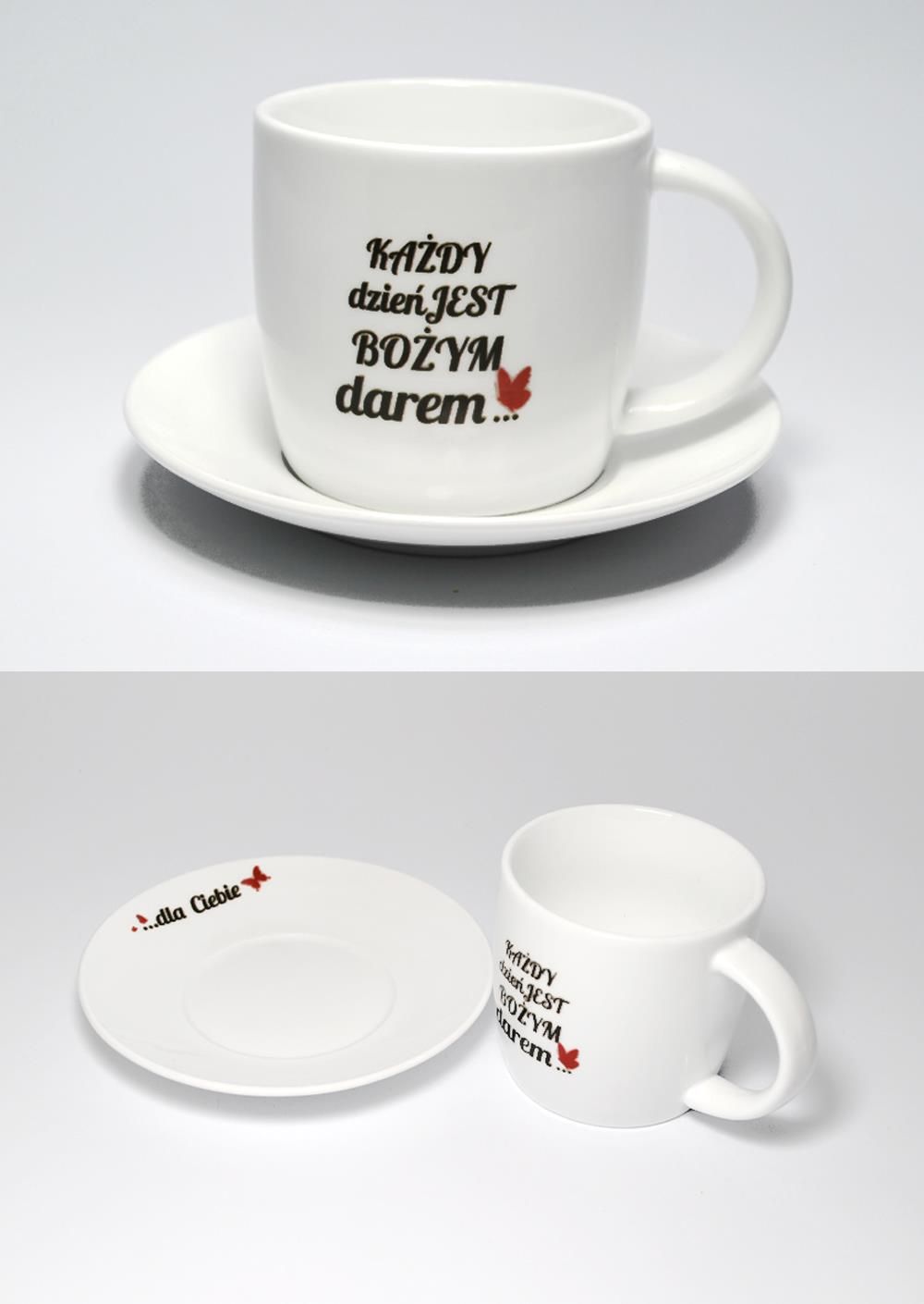 Porcelanowa filiżanka ze spodkiem. Nadruk na filiżance: Każdy dzień jest bożym darem... + grafika motyla Nadruk na spodku: ...dla Ciebie + grafika motyla Produkt nie nadaje się do mycia w zmywarkach. Filiżanka sprzedawana wraz z tekturowym pudełkiem. Kolor: biały Rodzaj szkliwa: błysk Wysokość: 74 …
