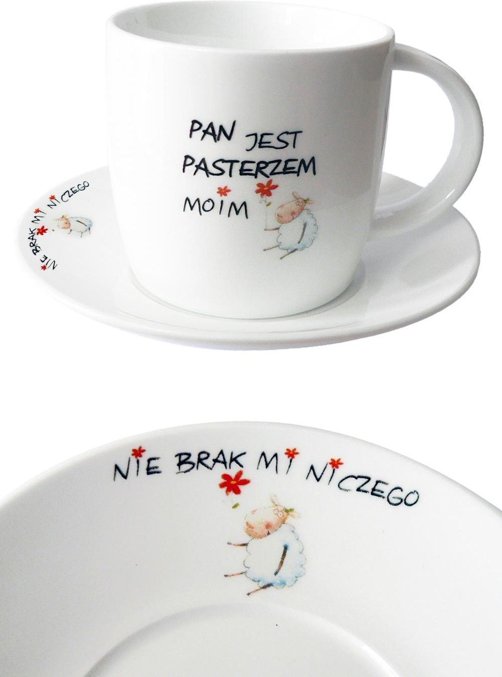 Porcelanowa filiżanka ze spodkiem. Kolorowy nadruk. Nadruk na filiżance: Pan jest pasterzem moim + rysunek owieczki Nadruk na spodku: Nie brak mi niczego + rysunek owieczki Produkt nie nadaje się do mycia w zmywarkach. Filiżanka sprzedawana wraz z tekturowym pudełkiem. Kolor: biały Rodzaj szkliwa: …