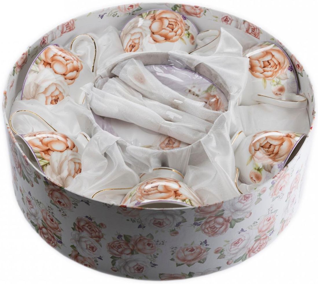 Zestaw sześciu filiżanek ze spodkami oraz łyżeczkami z kolekcji FUSAICHI PEGASUS. Komplet wykonany z bardzo dobrej jakości porcelany zdobionej kwiatami - kremowe róże, wykończone złotą i fioletową obwódką obrzeży elementów zestawu. Pojemność filiżanki 210 ml (pojemność liczona po rant filiżanki). Połączenie stonowanych kolorów i złota na zestawie tworzy harmonijną całość. Całość zapakowana w ozdobne pudełko dekorowane tym samym motywem to doskonały pomysł na niebanalny prezent urodzinowy zarówno dla kobiety i mężczyzny, a także podarunek dla szefa czy nauczyciela, również jako podziękowanie. Komplet idealnie sprawdzi się na uroczystości rodzinne czy na przyjacielskie "ploteczki" przy kawie. Wzór: KRE018 Produkt 6 x filiżanka 6 x spodek 6 x łyżeczki 1 x ozdobne pudełko Wymiary wysokość filiżanki 6 cm średnica filiżanki 10,4 cm średnica spodka 15 cm pojemność całkowita filiżanki 210 ml pojemność użytkowa filiżanki około 180 ml długość łyżeczki 12,5 cm wymiary pudełka 34 cm x 11,2 cm h Materiał wysokiej jakości porcelana Użytkowanie dopuszczone do kontaktu z żywnością
