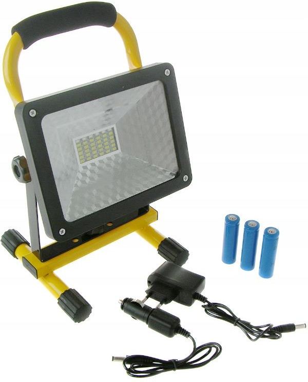 Lampa Robocza LED 100 W Energooszczędne oświetlenie przenośne. Cechy produktu: Obudowa wykonana z wysokiej jakości tworzywa, uchwyt i stojak ze stali Wyposażony w 30 diod LED białych, 3 diody LED czerwone oraz 3 diody LED niebieskie Klasa odporności: IP65 Odporny na wstrząsy Jest ekologiczny i energooszczędny, zużywa 10 razy mniej energii niż tradycyjne oświetlenie Idealnie oświetli parking, plac budowy, ulicę, alejkę parkową. Nadaje się przed garaż, magazyn, w gospodarstwach rolnych i agroturystyce. Wygodny uchwyt do przenoszenia pokryty pianką Zasilany na 3 wymienne ogniwa 18650 (Gratis w zestawie) W zestawie również ładowarka sieciowa oraz samochodowa Specyfikacja: 3 tryby świecenia: 50% mocy/ 100% mocy/ czerwone i niebieskie światło migające Barwa światła białego: zimna Żywotność diod: 50000 godzin Moc: 100 W Kąt świecenia: 120 stopni W zestawie: lampa led, ładowarka samochodowa, ładowarka sieciowa, 3 ogniwa 18650 Wymiary: Wysokość z uchwytem: 30 cm Wymiary podstawy: 17 x 16,5 cm