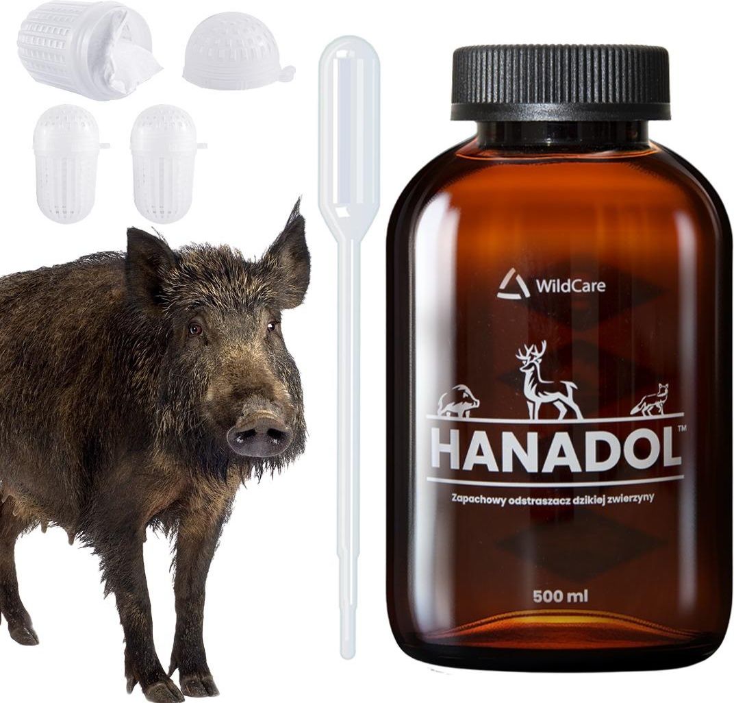 HANADOL odstraszacz na dziki, sarny 500ml POLSKI + pipeta i dyspensery HANADOL to polski środek odstraszający dziką zwierzynę - sprawdzony środek odstraszający zwierzynę - skoncentrowany zapach ludzkiego potu. Doskonale odstrasza dziki oraz inne zwierzęta mogące bezpośrednio zagrażać uprawom. Hanadol posiada najwyższe stężenie substancji aktywnych na rynku europejskim! 🟦 Właściwości: ◼️ skutecznie odstrasza dziki i inne zwierzęta leśne ◼️ działa natychmiast po zastosowaniu ◼️ ogranicza szkody wyrządzone przez dzikie zwierzęta ◼️ wyjątkowo mocny i wydajny ◼️ długotrwałe działanie - nawet do 3 tygodni Nowoczesna butelka posiada zgrzewaną przekładkę, dzięki której ograniczone jest ryzyko rozprzestrzeniania zapachu podczas magazynowania. Dodatkowo nakrętka typu naciśnij-odkręć (child-proof) chroni przed rozlaniem i dostępem dzieci.