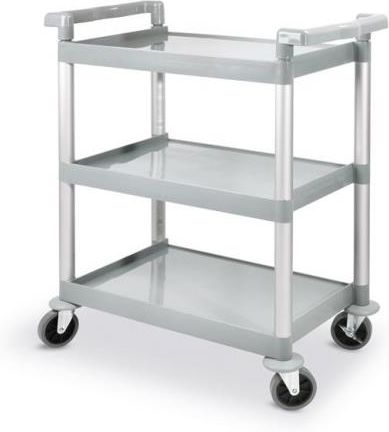 Wózek kelnerski 3-półkowy z polipropylenu Odpowiedni jako mobilne narzędzie pracy z możliwością składowania. Płynnie porusza się po nierównych powierzchniach, w windach czy przejściach. Górna półka na ergonomicznej wysokości dla zapewnienia większego komfortu pracy. Maksymalne obciążenie na półkę (równomiernie rozłożone): 50 kg. Wyposażony w 4 obrotowe kółka, 2 z hamulcami. Zaokrąglone krawędzie. Odległość między półkami: 293 mm. Wymiary półki: 625x400 mm. Dane techniczne Liczba półek: 3 Maksymalny udźwig: 50 Możliwość piętrowania: Nie Długość (mm): 800 Waga netto (kg): 5.677 EAN: 8711369810200 Wysokość (mm): 945 Materiały: PP (Polipropylen) Odległość pomiędzy tacami (mm): 293 Marka: AmerBox Szerokość (mm): 420 Składany: Nie
