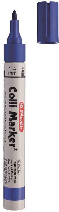* markery permanentne HERLITZ COLLI-MARKER * trwałe markery w metalowej obudowie * wodoodporne na prawie każdym materiale * nie zawierają ksylenu i toluenu (ksyleny – organiczne związki chemiczne z grupy węglowodorów aromatycznych, dimetylowe pochodne benzenu - stosowane są głównie jako wysokowrzące rozpuszczalniki organiczne, toluen – organiczny związek chemiczny z grupy węglowodorów aromatycznych, stosowany często jako rozpuszczalnik organiczny - odkrywcą toluenu jest polski chemik Filip Walter) * grubość linii pisania 1-4 mm * dzięki różnym grubościom kreski są idealne do wszelkiego rodzaju pisania – cienką kreską na płycie CD lub DVD, lub grubszą kreską na papierze do flipchartów * długość linii pisania: 350 m * możliwość napełniania tuszem * kolory: czerwony, niebieski, czarny * pojemność: 4 ml * nie rozmazują się * innowacyjna końcówka pozwala na bezpieczne i wygodne pisanie na niemal wszystkich rodzajach materiałów * jednostka sprzedaży 1 sztuka * HERLITZ Sp. z o.o. to jeden z liderów rynku artykułów szkolnych i biurowych w Polsce – produkty tej marki cieszą się od wielu lat popularnością i uznaniem konsumentów, towarzysząc im w nauce, pracy, zabawie i codziennym życiu – w ofercie znajduje się ponad 4500 produktów w takich kategoriach, jak: papier, tekstylia, biuro, plastyka, artykuły piśmienne i dekoracyjne