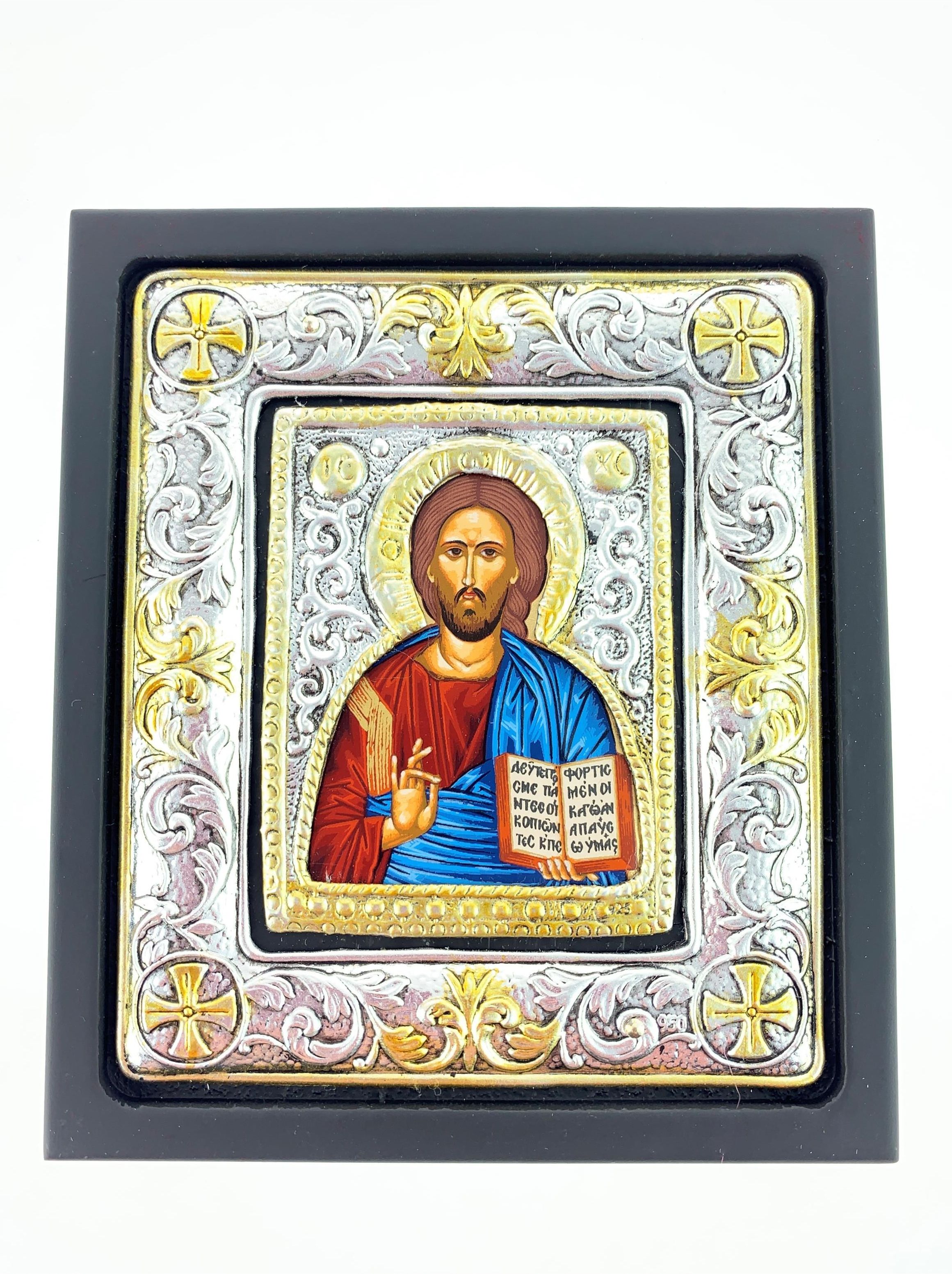 Ikona grecka na desce, w etui Rękodzieło prosto z Grecji. Koszulka metalowa została posrebrzona srebrem próby 925. Wspaniała pomysł na prezent urodzinowy lub pamiątkę I Komunii św. Ikona posiada stosowny certyfikat. Wymiary ikony: 10 x 11,5 cm