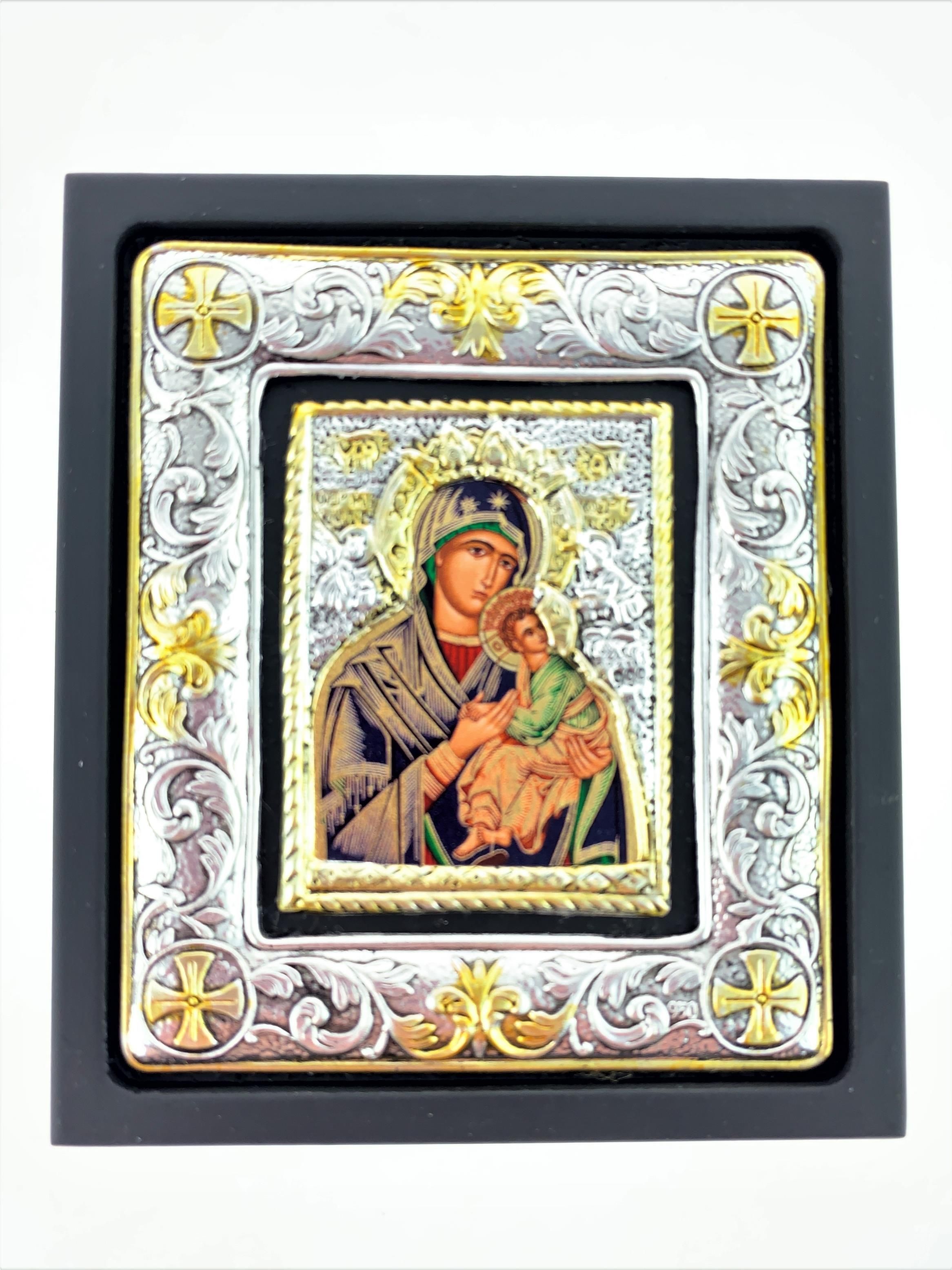 Ikona grecka na desce, w etui Rękodzieło prosto z Grecji. Koszulka metalowa została posrebrzona srebrem próby 925. Wspaniała pomysł na prezent urodzinowy lub pamiątkę I Komunii św. Ikona posiada stosowny certyfikat. Wymiary ikony: 10 x 11,5 cm